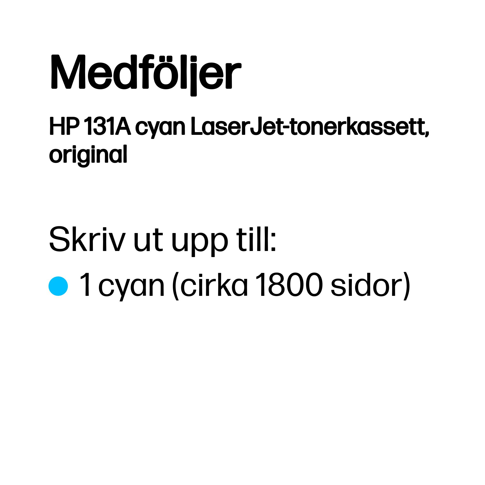 Med HP 131A cyan LaserJet-tonerkassett kan du skriva ut dokument och marknadsföringsmaterial av professionell kvalitet hemma eller på kontoret. Upprätthåll produktiviteten genom att undvika slöseri med tid och förbrukningsmaterial. Dessa tonerkassetter har utvecklats speciellt för din skrivare.