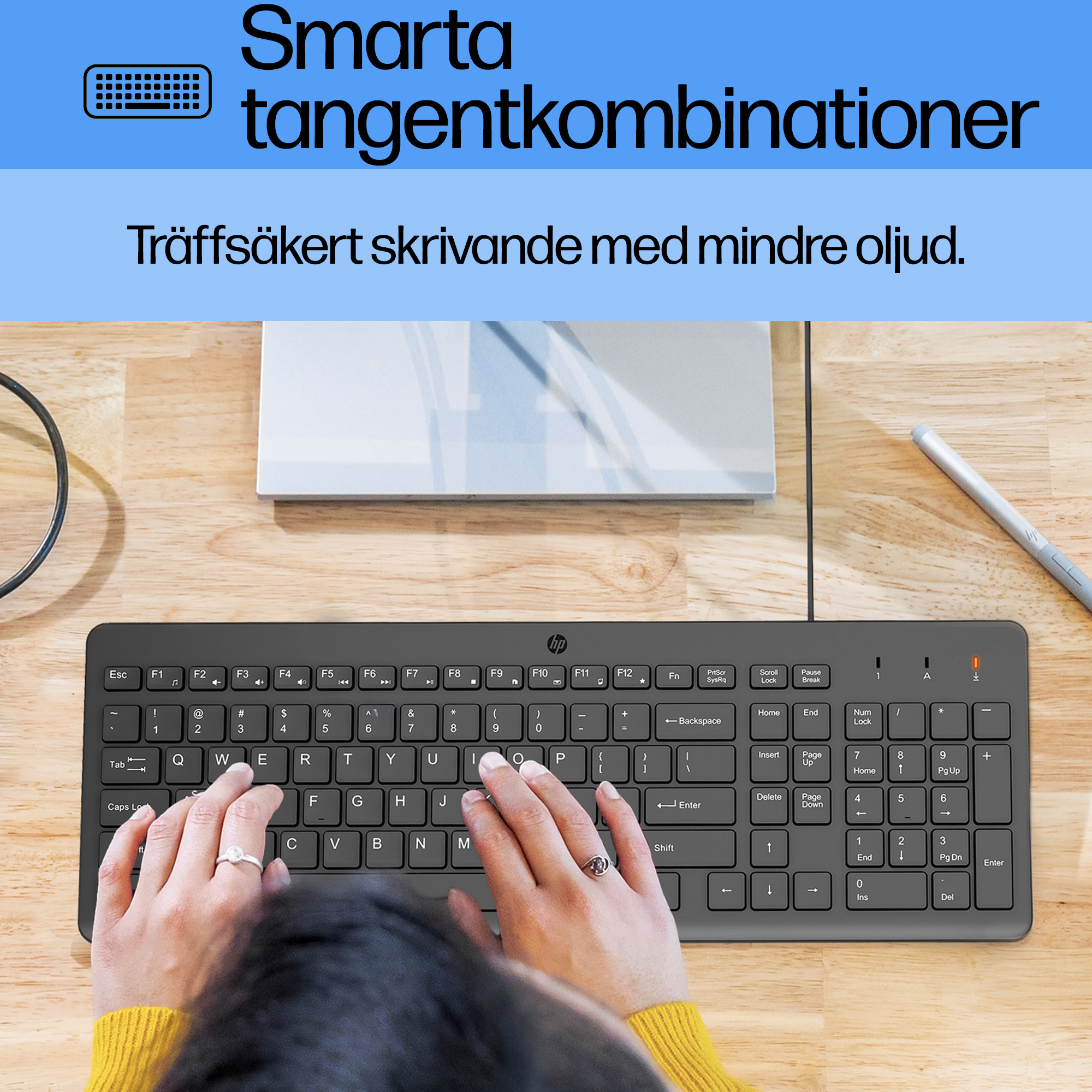 Tangentbord med en snygg design och tysta nedslag. Lågprofilsdesignen ger tysta, bekväma och exakta nedslag … helt i stil med hur du skriver.