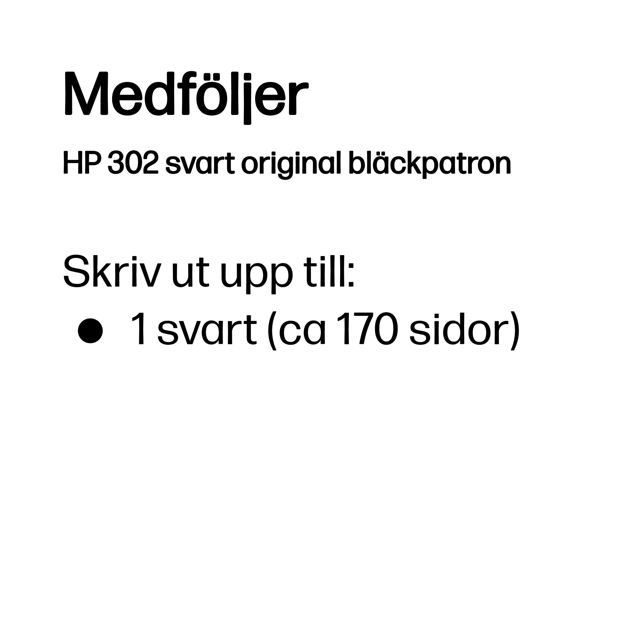 | Kompatibilitet | HP 302-bläckpatroner fungerar med: HP DeskJet 3630, 3633, 3639 HP Envy 4520, 4524, 4526, 4527, 4528 HP OfficeJet 3831, 3833, 3835, 4650, 4652, 4654, 4657, 4658, 5220, 5230 |