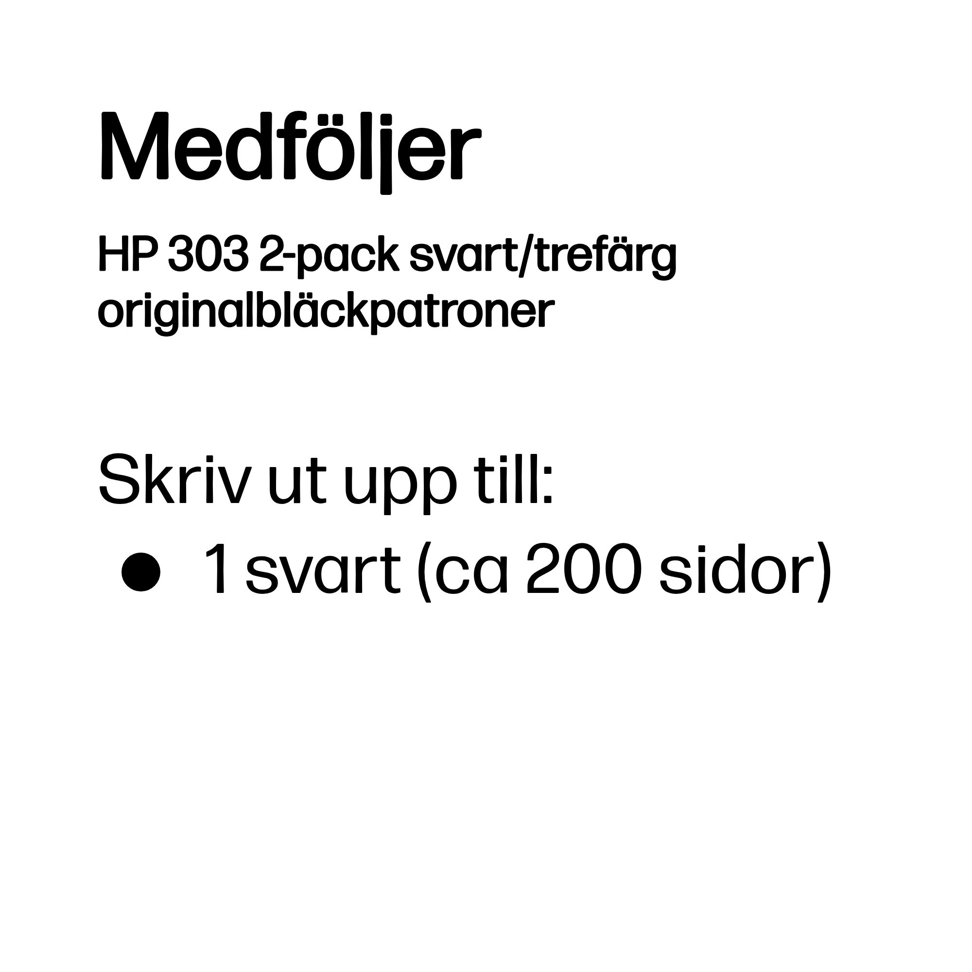 | Kompatibilitet | HP 303-bläckpatroner fungerar med: HP Envy 6200, 7134, 7800 |