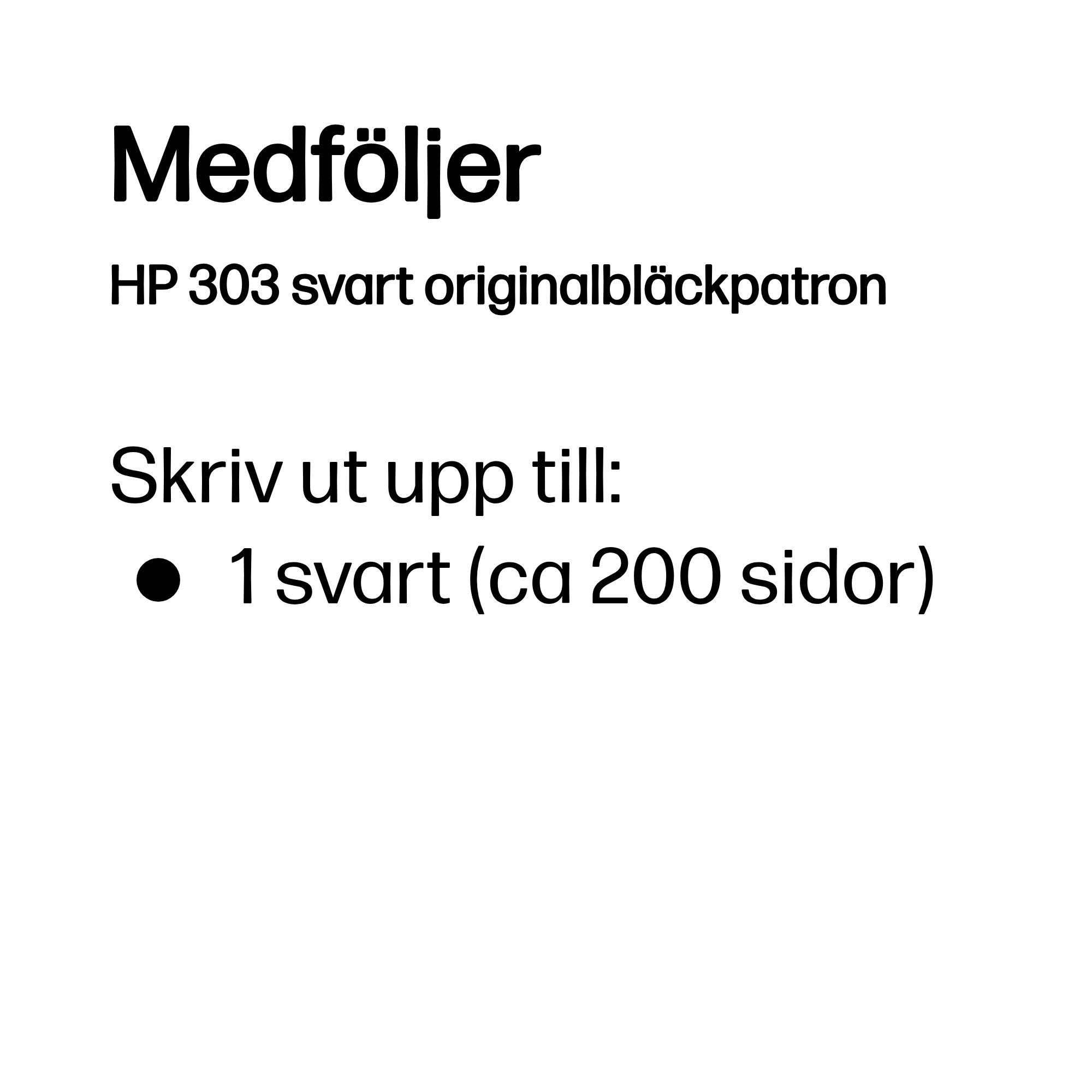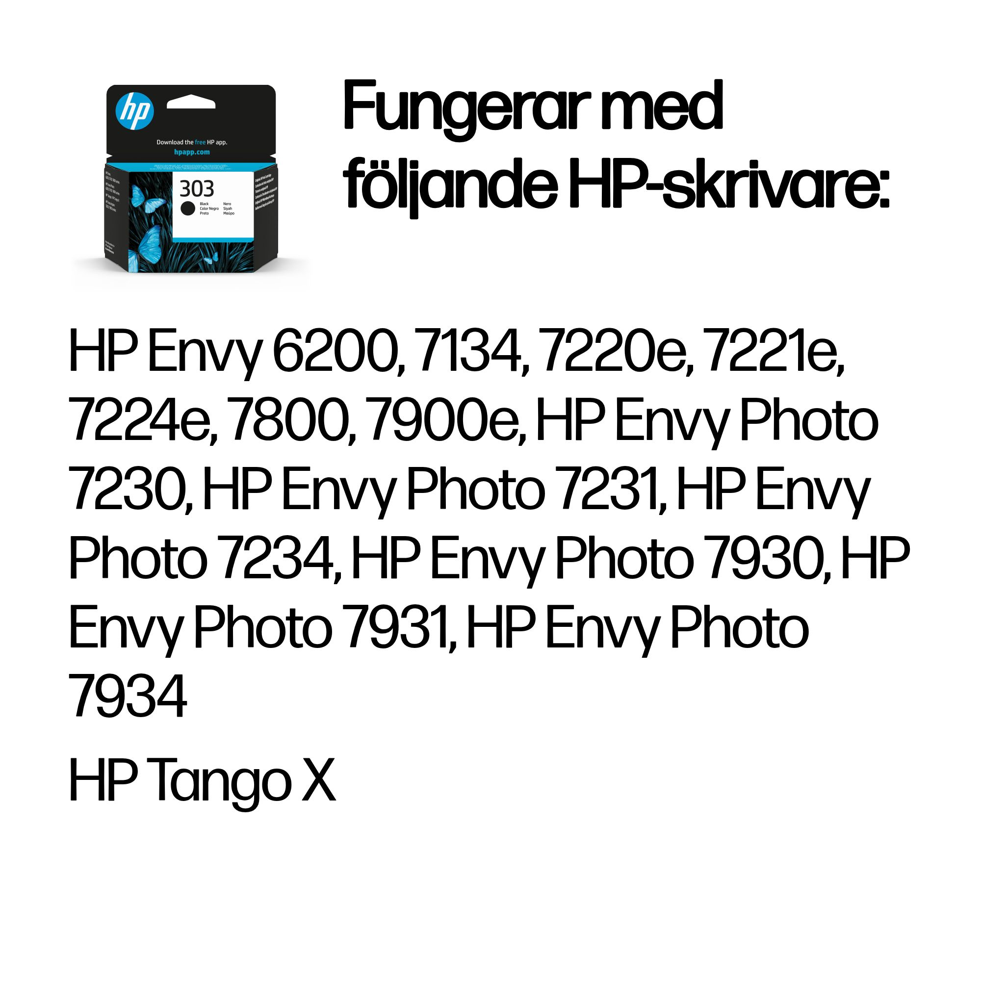 | Kompatibilitet | HP 303-bläckpatroner fungerar med: HP Envy 6200, 7134, 7220e, 7221e, 7224e, 7800, 7900e, HP Envy Photo 7230, HP Envy Photo 7231, HP Envy Photo 7234, HP Envy Photo 7930, HP Envy Photo 7931, HP Envy Photo 7934 HP Tango X |