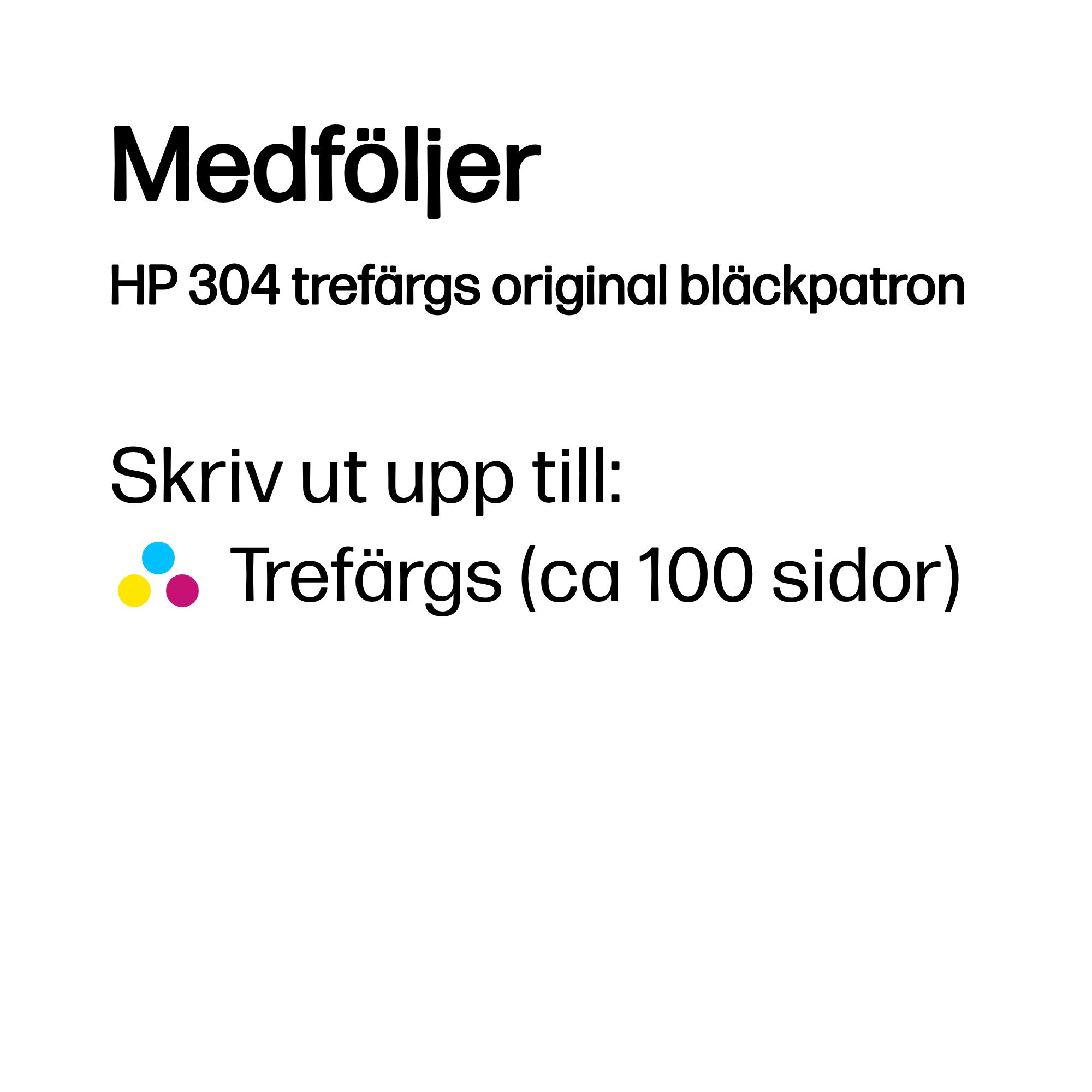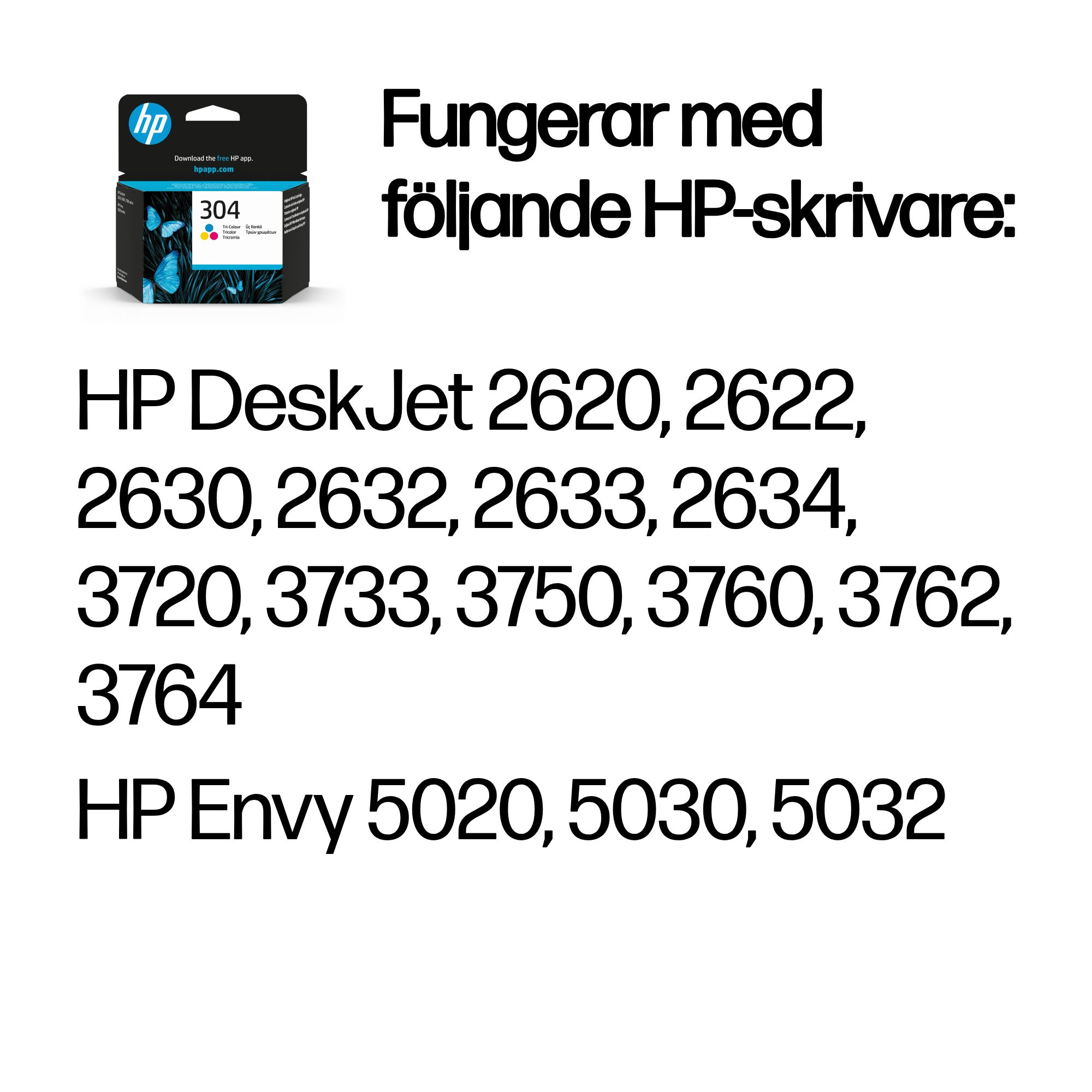 | Kompatibilitet | HP 304-bläckpatroner fungerar med: HP DeskJet 2620, 2622, 2630, 2632, 2633, 2634, 3720, 3733, 3750, 3760, 3762, 3764 HP Envy 5020, 5030, 5032 |