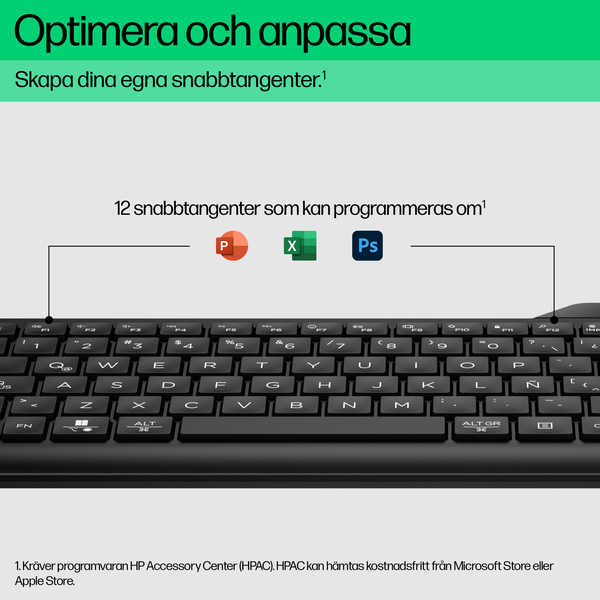 Rätt mängd flexibilitet räcker långt. Programmera tangenterna F1–F12 till att vara anpassade genvägar eller automatisera komplicerade tangentkombinationer till att utföra vardagliga uppgifter, mycket snabbare<sup>[1]</sup>. Programvaran HP Accessory Center gör det enkelt att konfigurera och ändra kommandon i rena farten.