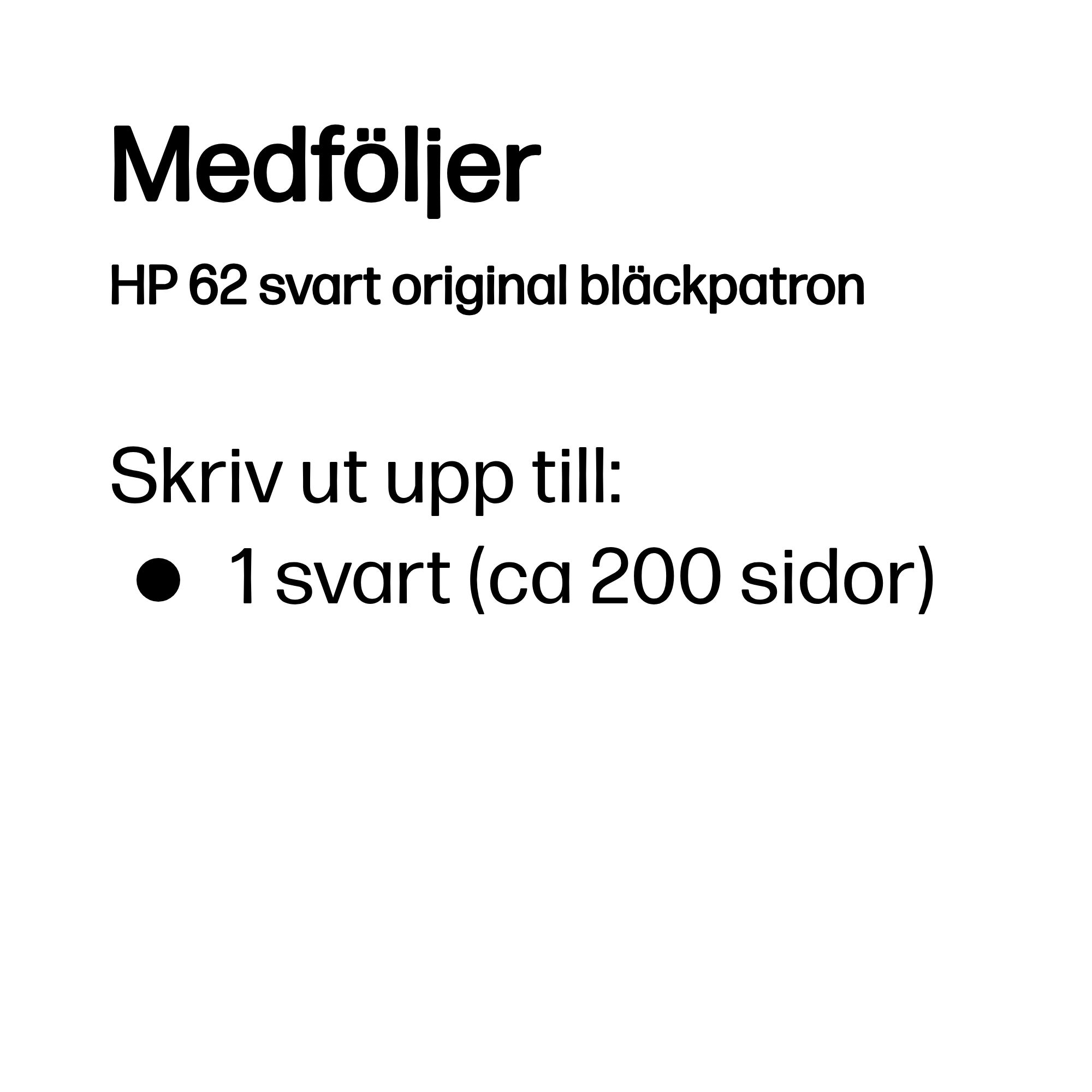 | Kompatibilitet | HP 62-bläckpatroner fungerar med: HP Envy 5540, 5542, 5543, 5642, 5644 HP OfficeJet 200, 250, 5740, 5742, 5744 |