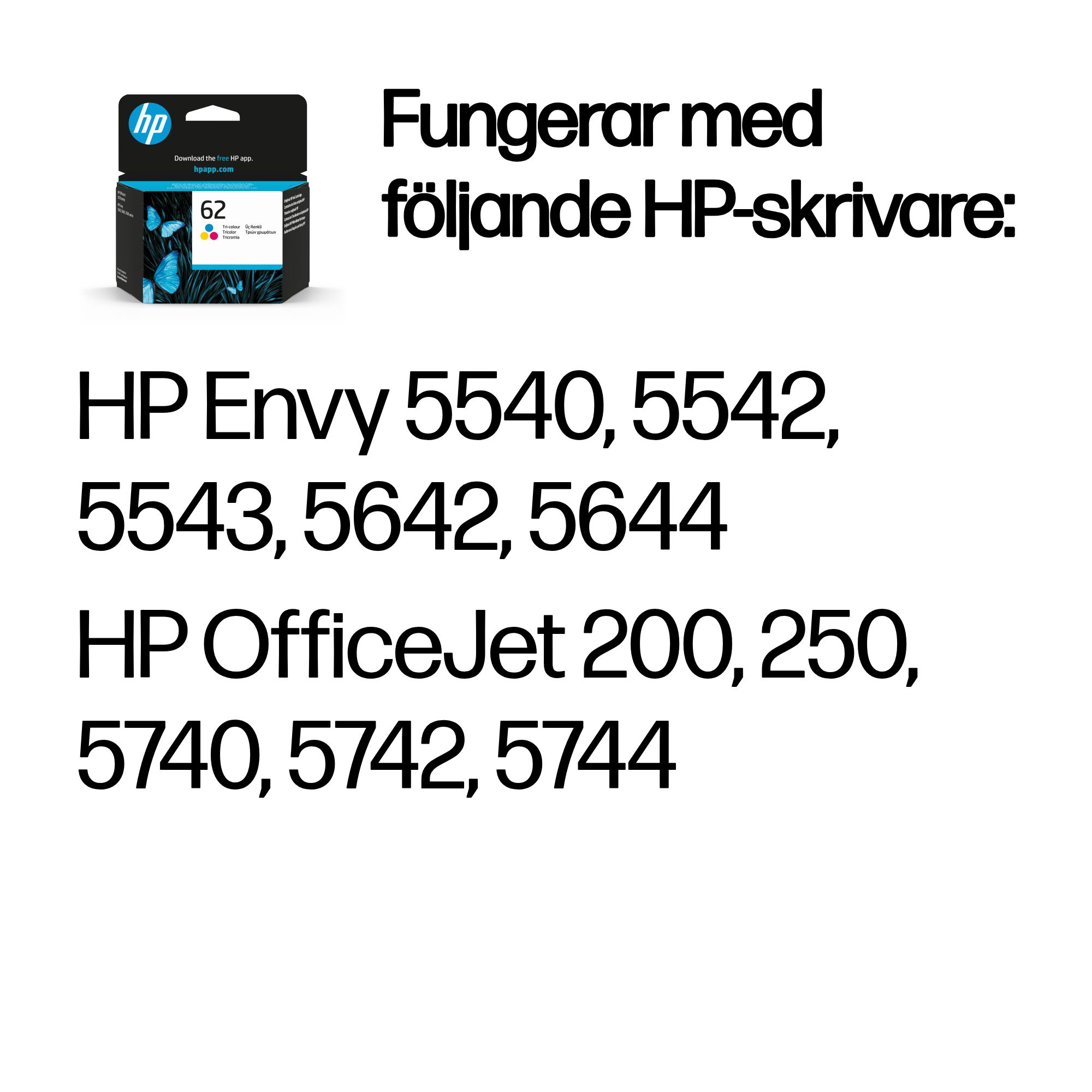 | Kompatibilitet | HP 62-bläckpatroner fungerar med: HP Envy 5540, 5542, 5543, 5642, 5644 HP OfficeJet 200, 250, 5740, 5742, 5744 |