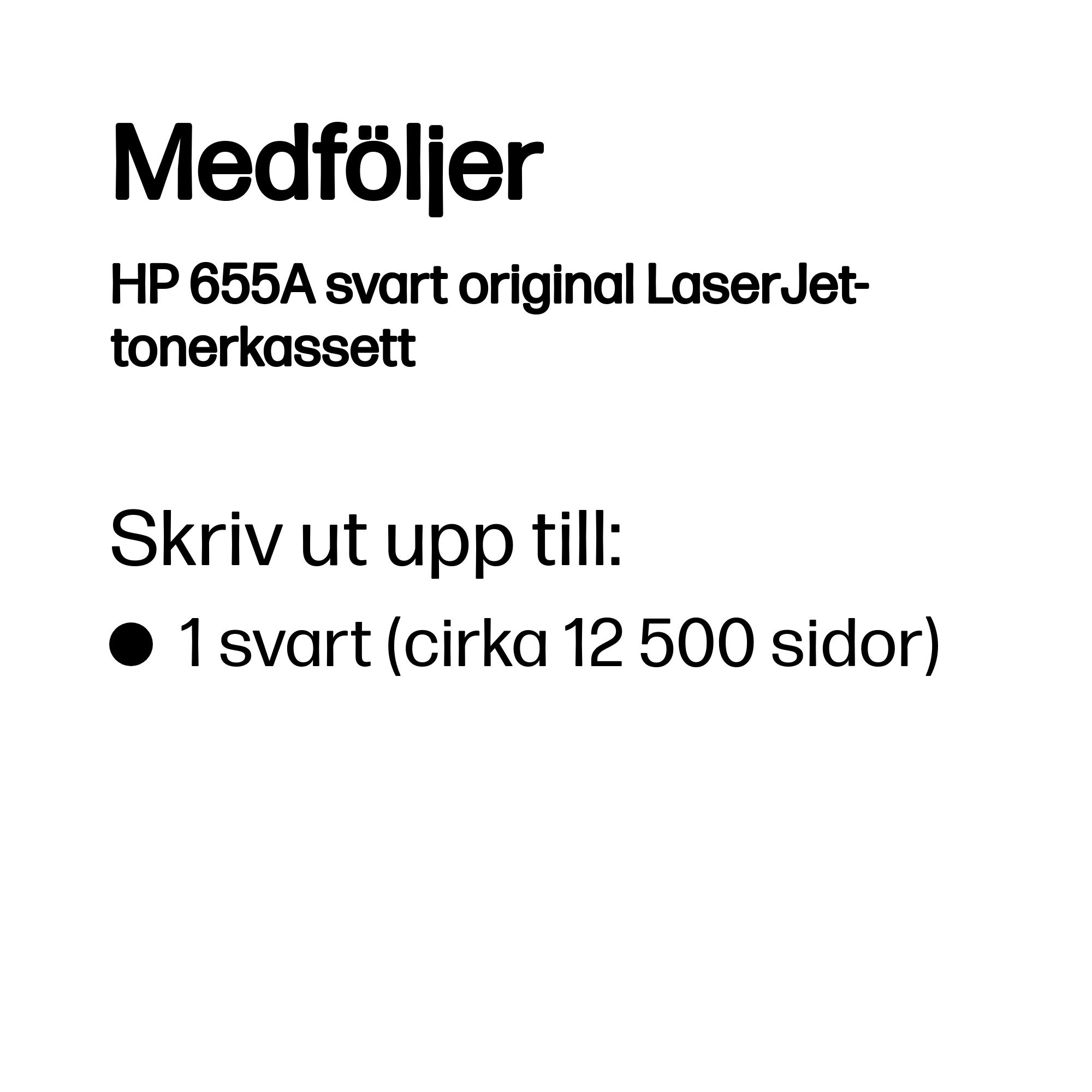 | Kompatibilitet | HP 655 tonerkassetter fungerar med: HP LaserJet Enterprise M652, M653, M681, M682 |
