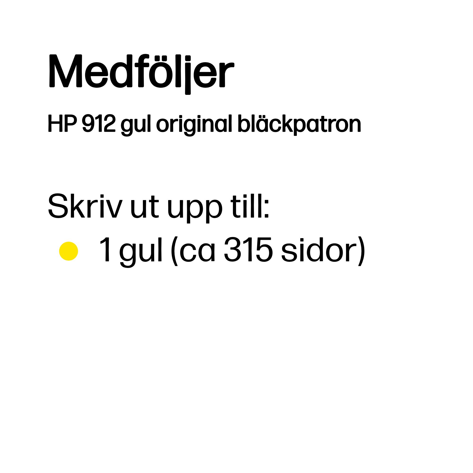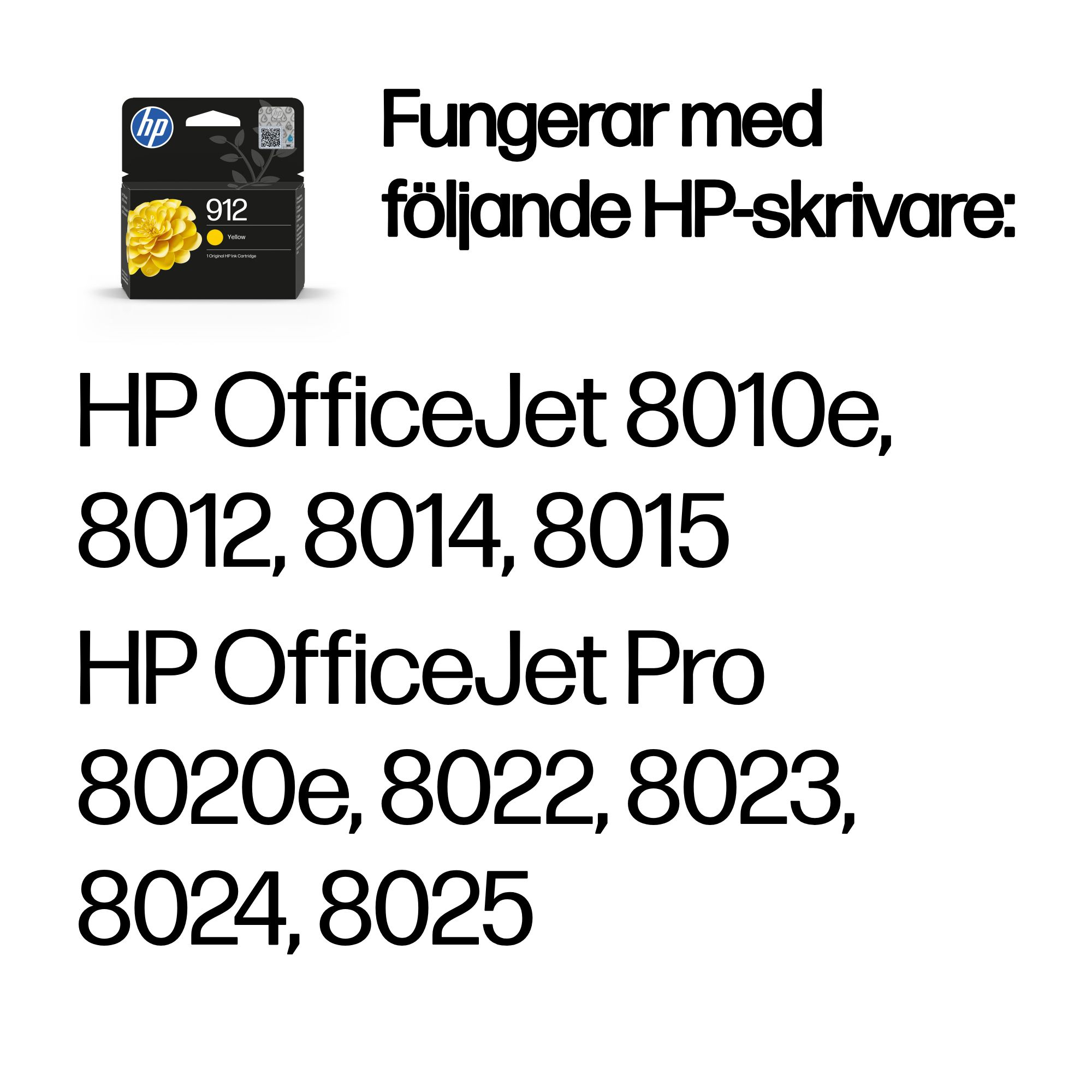 | Kompatibilitet | HP 912-bläckpatroner fungerar med: HP OfficeJet 8010e, 8012, 8014, 8015 HP OfficeJet Pro 8020e, 8022, 8023, 8024, 8025 |