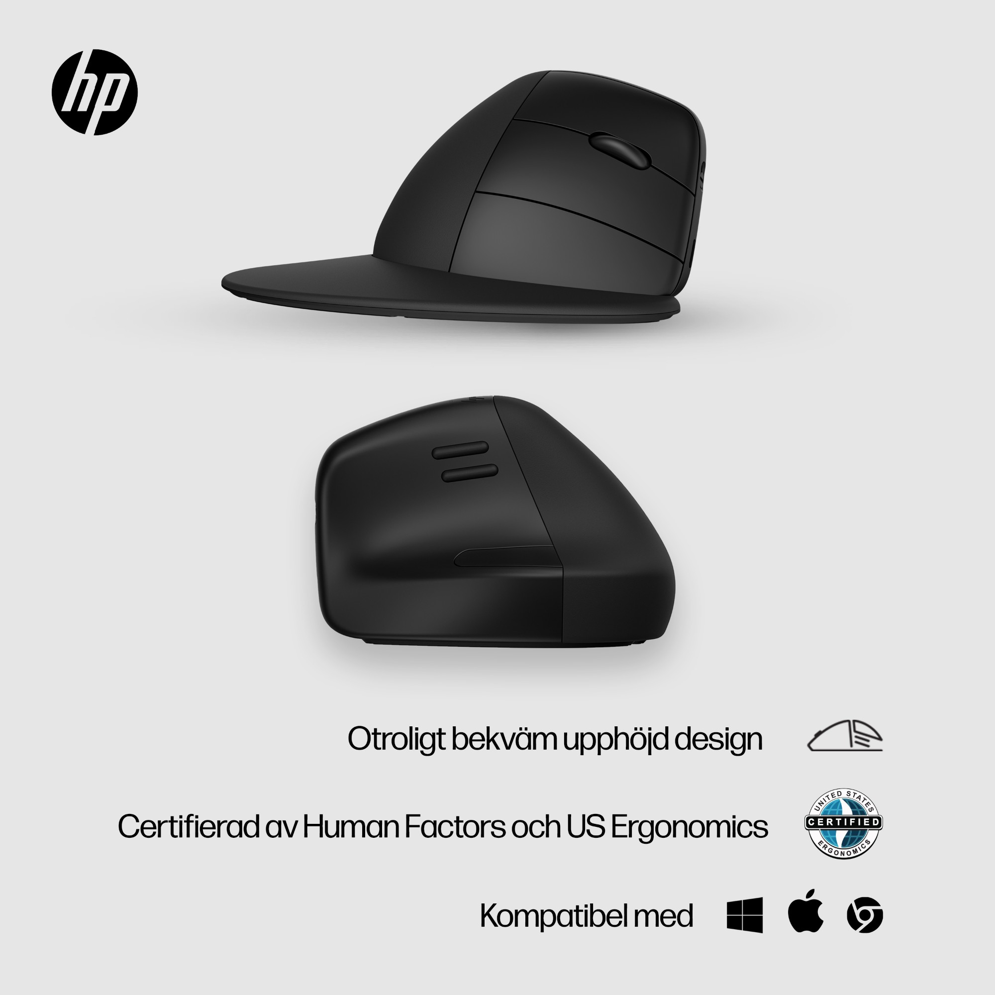 Från stationär dator till bärbar dator till platta och tillbaka – den här ergonomiska musen förblir ansluten till upp till tre enheter samtidigt med HP Unifying Dongle eller Bluetooth® 5.3. Stöd för flera operativsystem innebär en smidig övergång även mellan Windows®-, Apple- och Chrome-enheter. Den enkla växlingsknappen innebär konstant anslutning och kontroll över varje klick.