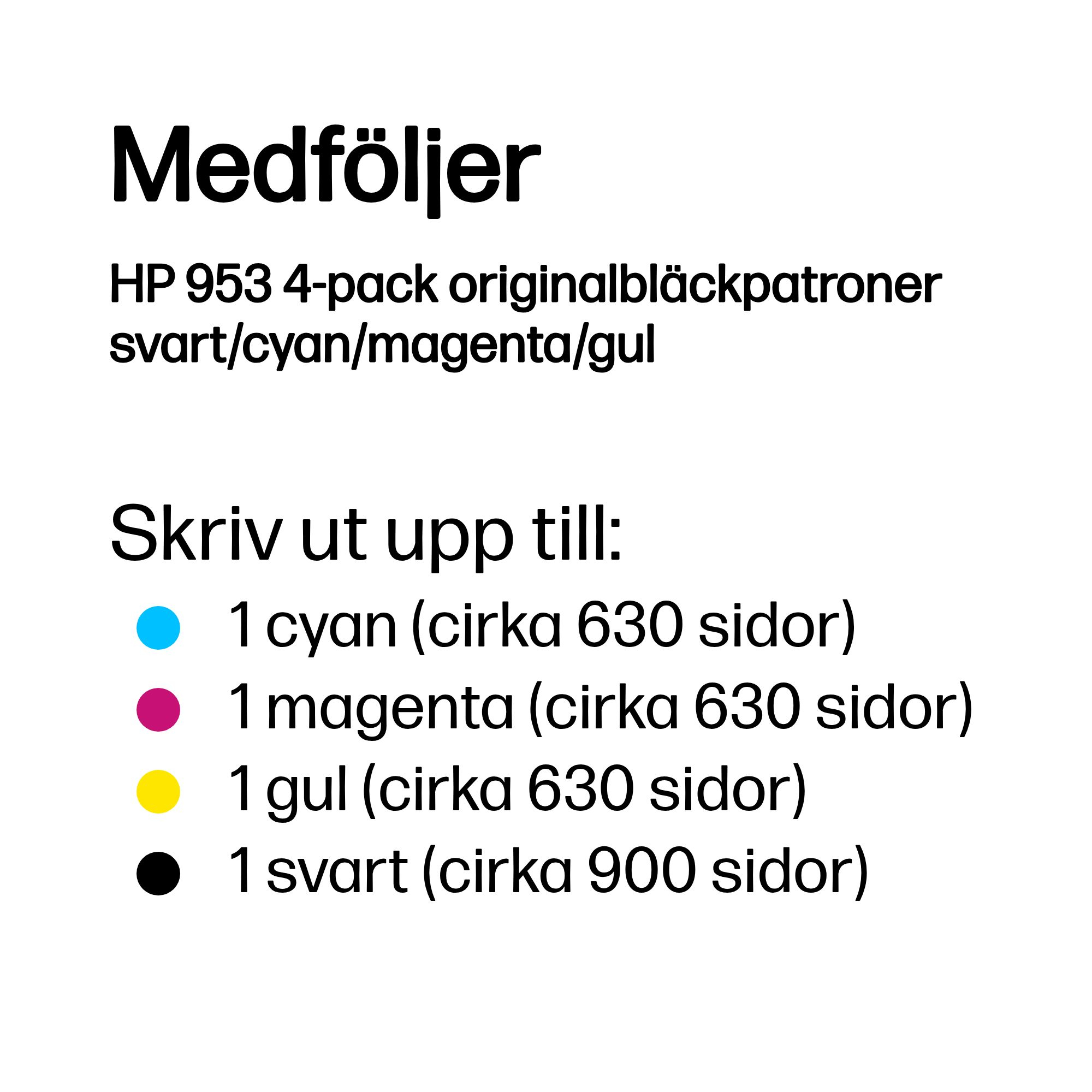 | Kompatibilitet | HP 953-bläckpatroner fungerar med: HP OfficeJet Pro 7720, 7730, 7740, 8210, 8720, 8730 |