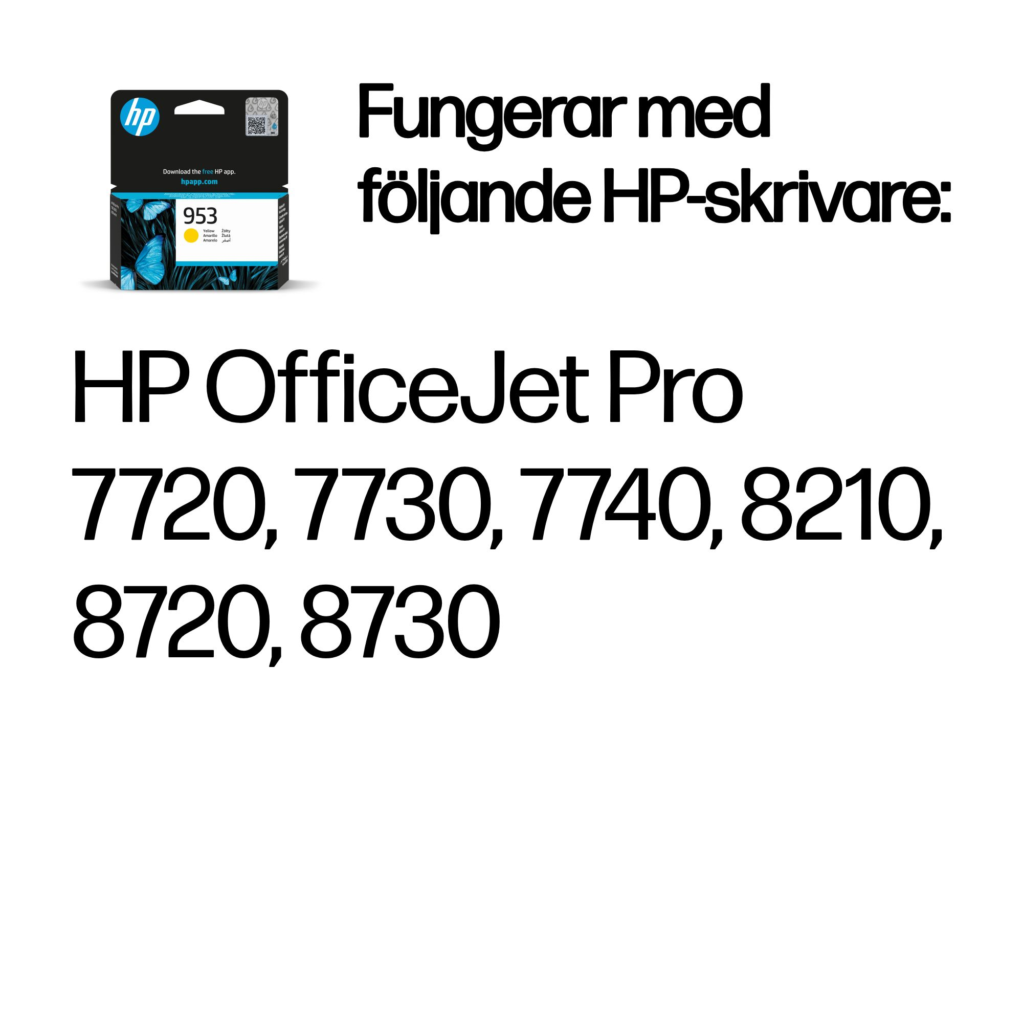 | Kompatibilitet | HP 953-bläckpatroner fungerar med: HP OfficeJet Pro 7720, 7730, 7740, 8210, 8720, 8730 |