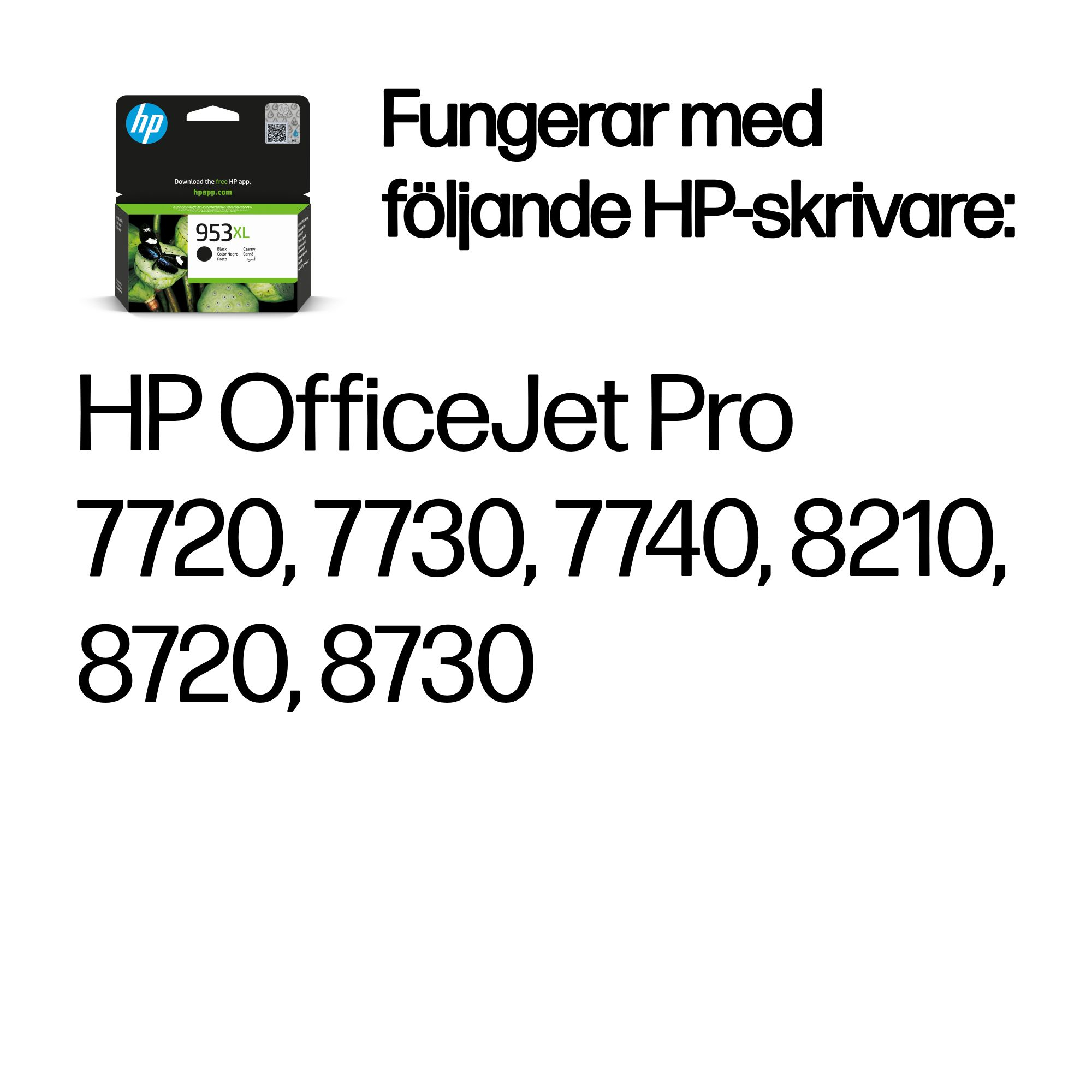 | Kompatibilitet | HP 953-bläckpatroner fungerar med: HP OfficeJet Pro 7720, 7730, 7740, 8210, 8720, 8730 |