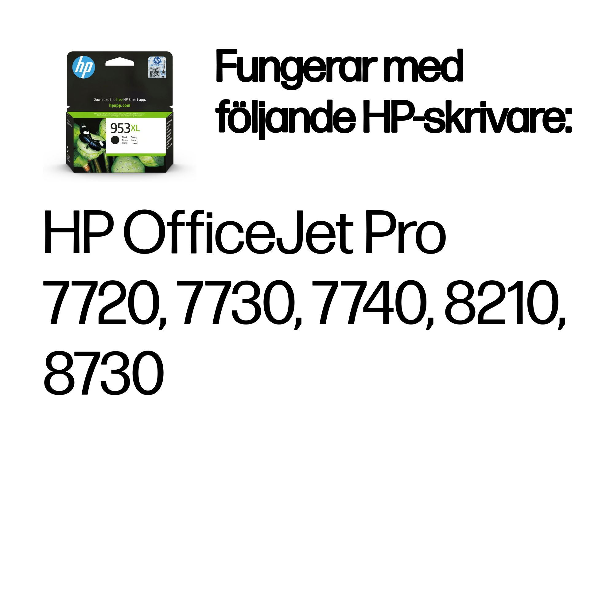 Kompatibilitet | HP 953-bläckpatroner fungerar med: HP OfficeJet Pro 7720, 7730, 7740, 8210, 8720, 8730 |