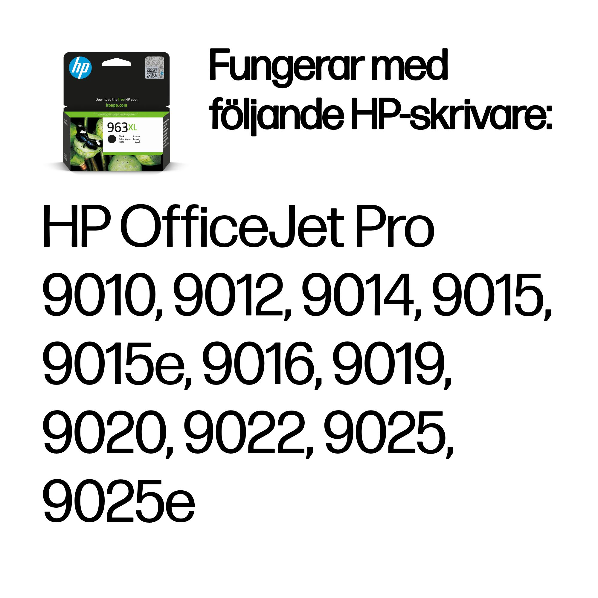 | Kompatibilitet | HP 963-bläckpatroner fungerar med: HP OfficeJet Pro 9010, 9012, 9014, 9015, 9015e, 9016, 9019, 9020, 9022, 9025, 9025e |