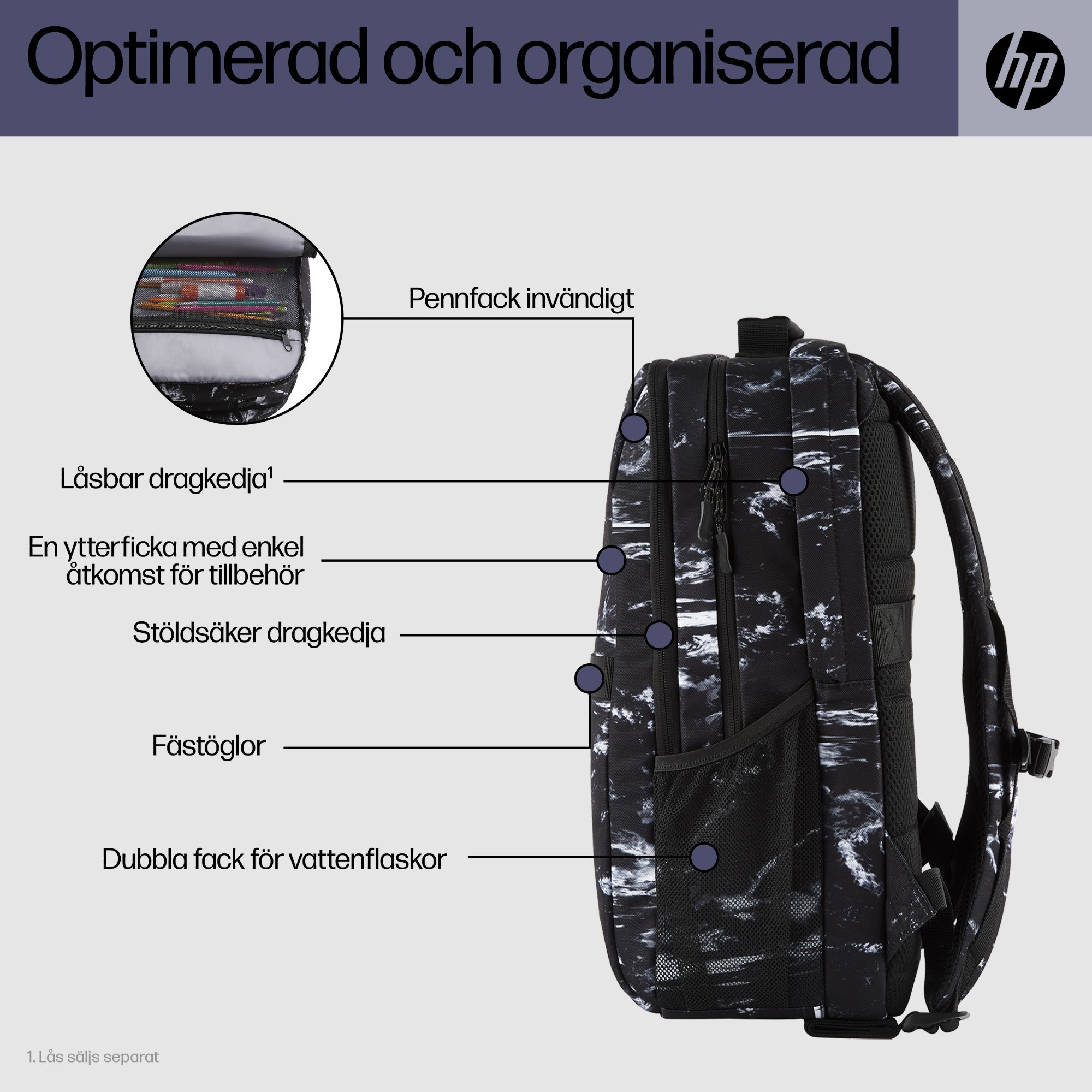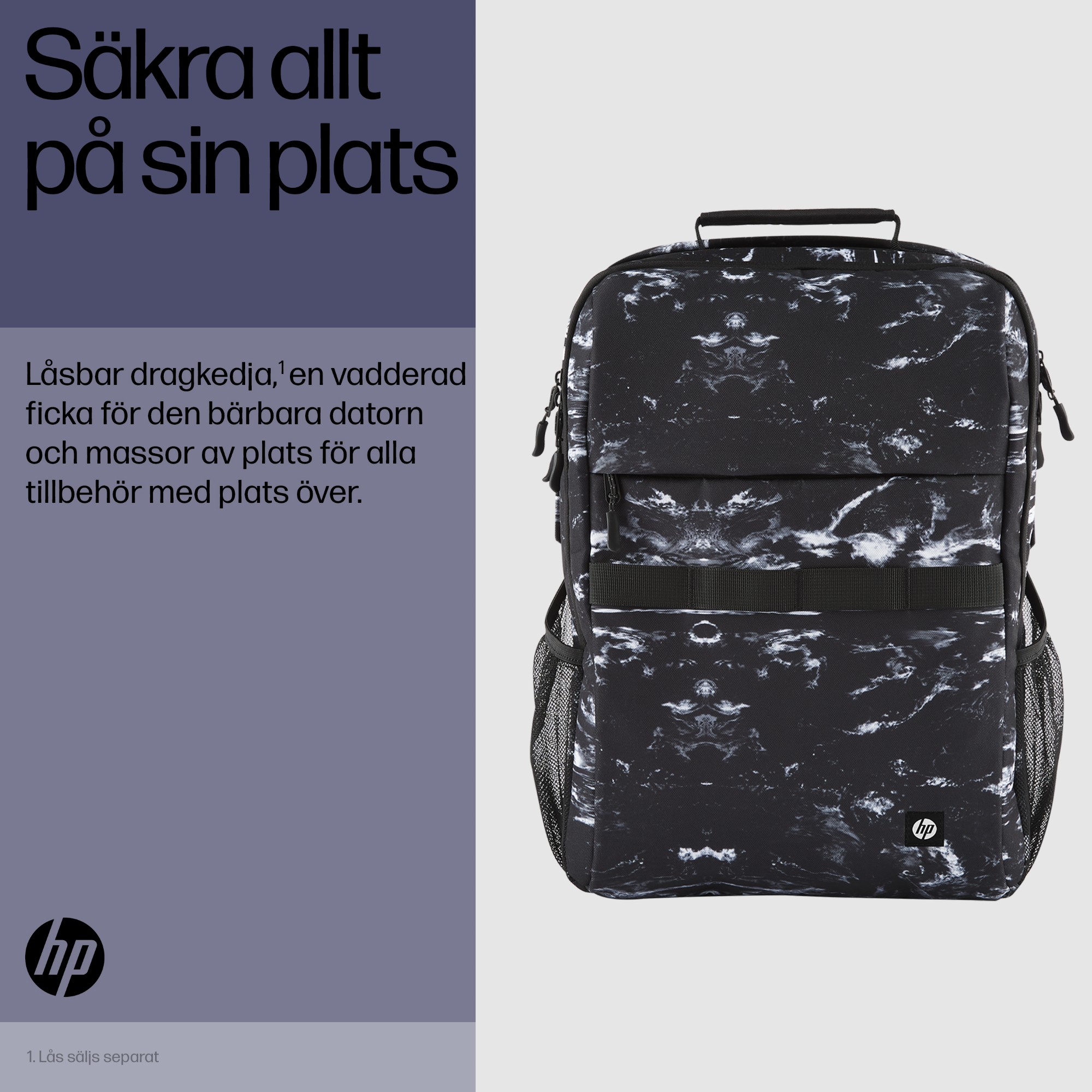 Var på språng med alla tillbehör – allt organiserat och med stil. Packa för det första in lite sinnesro i den här extra säkra ryggsäcken med en låsbar dragkedja[1] och regnavvisande material. Placera sedan den bärbara datorn i den vadderade fickan, säkra alla tillbehör med utrymme som räcker och blir över och var på språng en hel dag utan att stanna upp.