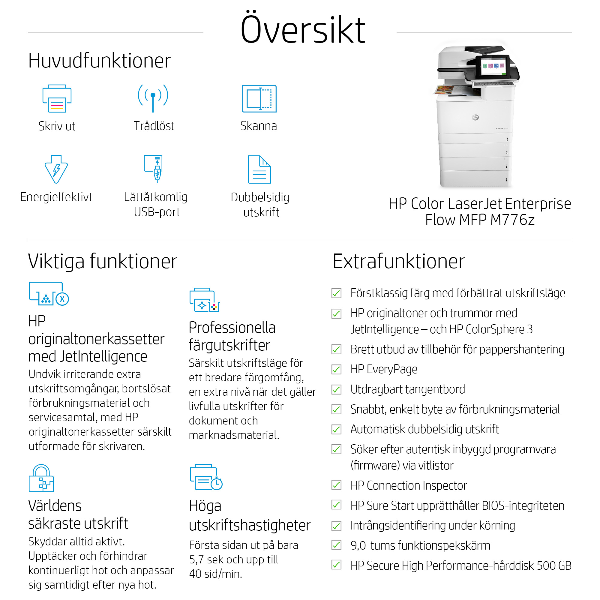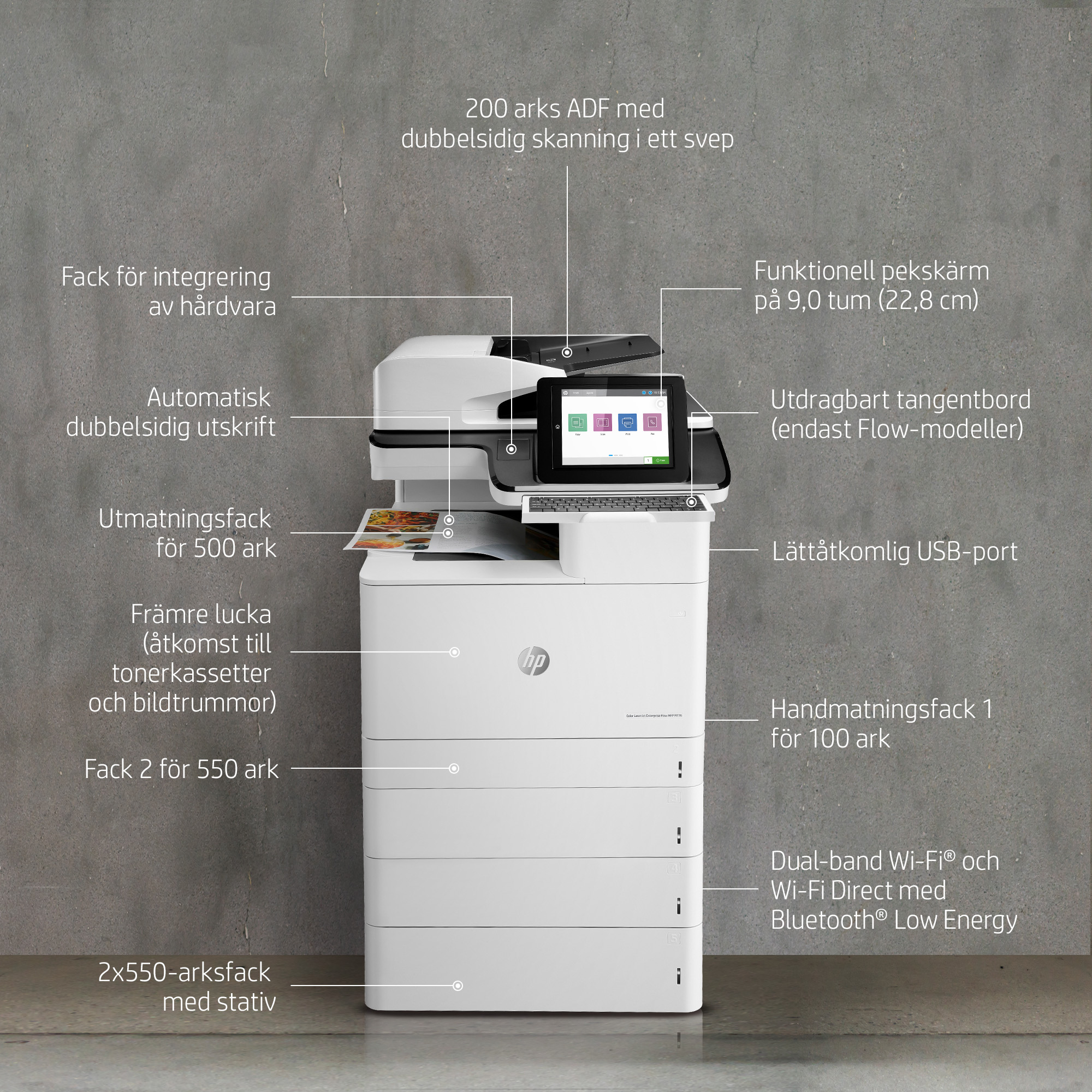 HP Color LaserJet Enterprise Flow LaserJet Enterprise Flow M776z Trådlöst Multifunction Färg Skrivare, Kopiator och skanner; Dubbelsidigt