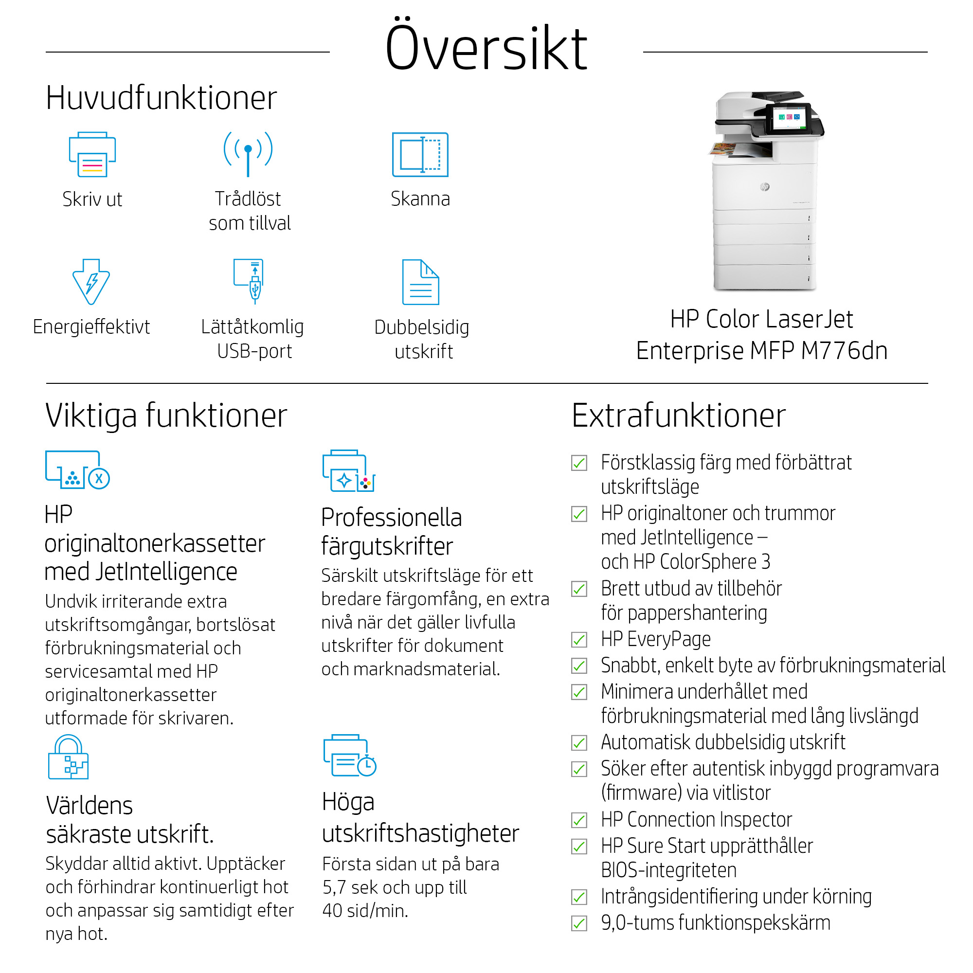 HP Color LaserJet Enterprise LaserJet Enterprise M776dn Multifunction Färg Skrivare, Endast Ethernet; Kopiator och skanner
