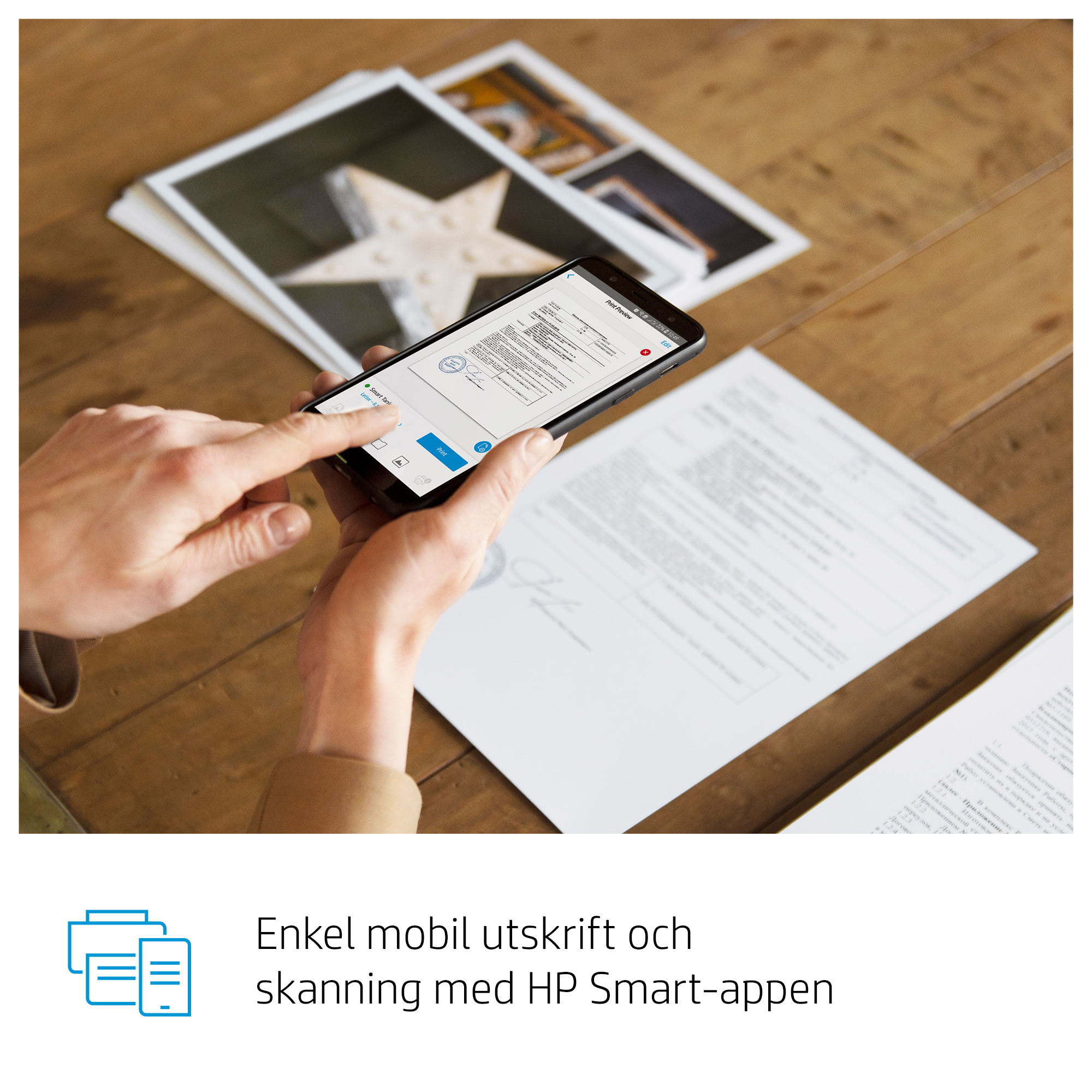 Skriv ut och skanna enkelt från mobil enhet med HP Smart – den mobila utskriftsappen som är bäst i sin klass.[3,4]