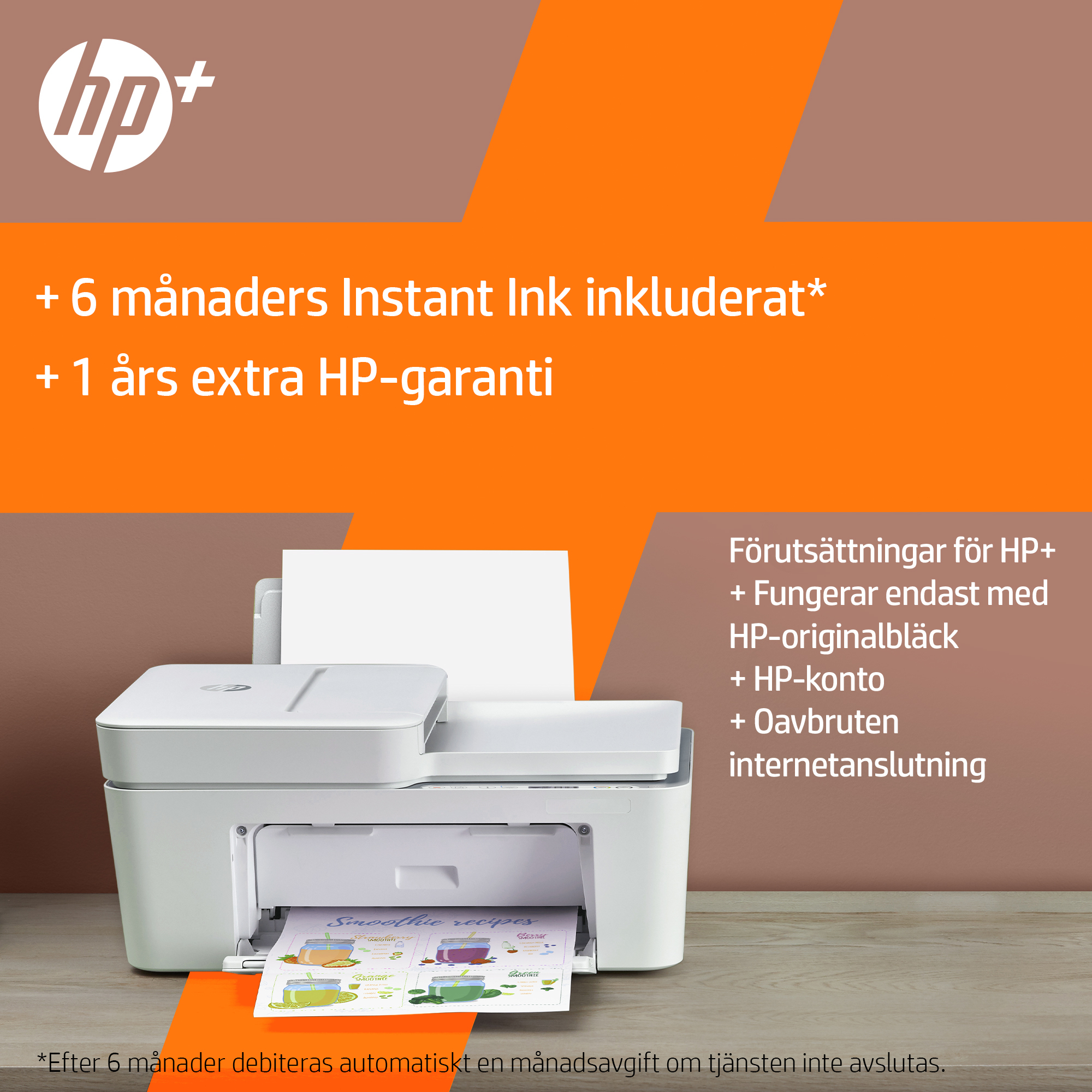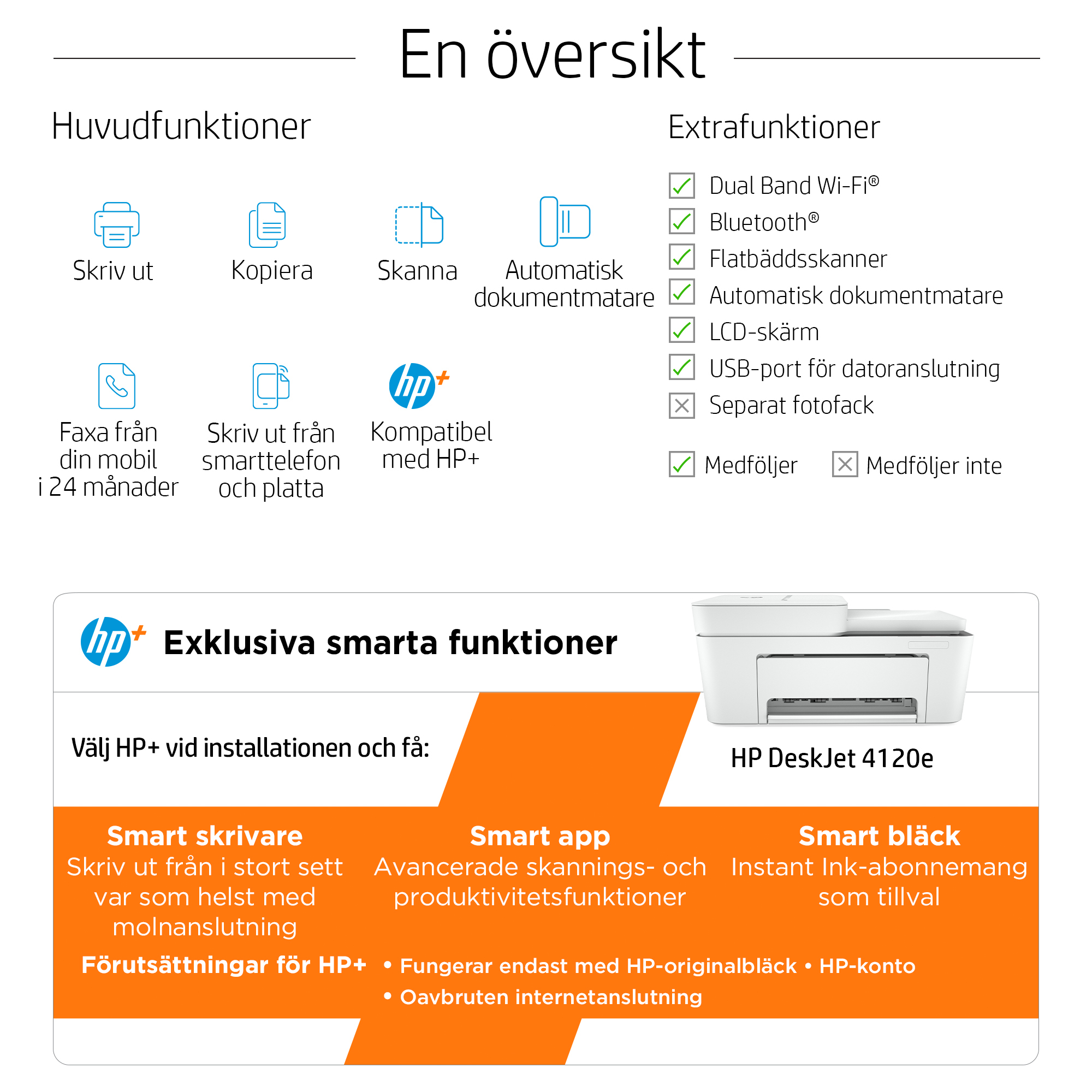 Den här skrivaren är kompatibel med HP+. Välj HP+ under produktinstallationen för att ta del av fördelarna. För att HP+ ska fungera under skrivarens hela livstid krävs ett HP-konto, kontinuerlig anslutning till internet och att du bara använder HP-originalbläckpatroner. Mer information på: http://www.hp.com/plus