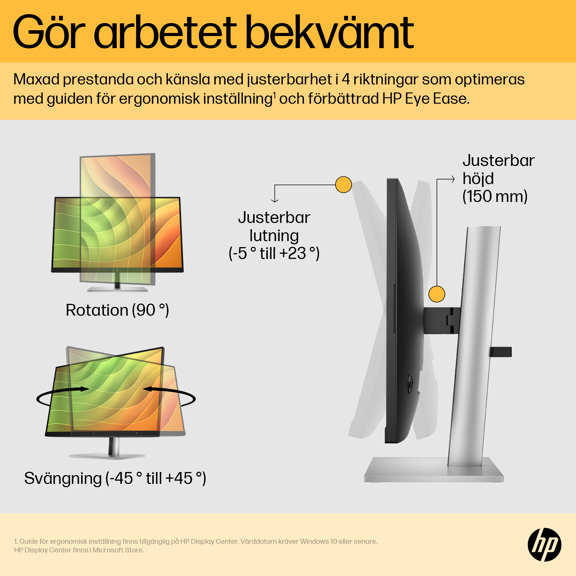 När en intensiv arbetsdag kräver bästa möjliga komfort är det lätt att hitta den tack vare justerbarhet i fyra riktningar som optimeras med hjälp av steg för steg-guiden för ergonomisk montering i HP Display Center[3]. Bidrar till större ögonkomfort med den flimmerfria skärmen, en uppdateringsfrekvens på 75 Hz[1] och HP Eye Ease – ett alltid aktivt och inbyggt filter som reducerar blått ljus.