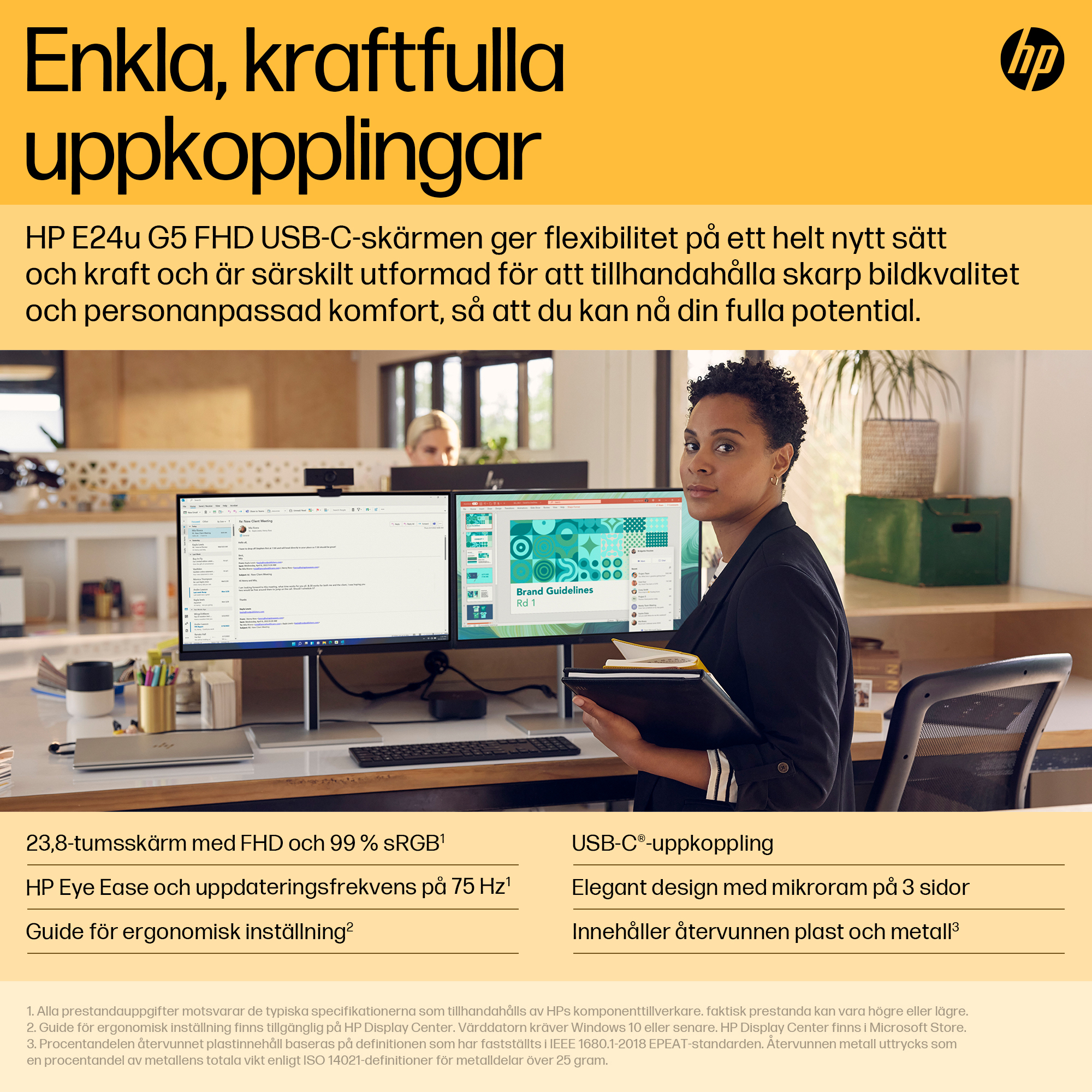 Skärmen HP E24u G5 FHD USB-C är avsiktligt designad för att leverera skarpa bilder och personlig komfort samt skapar en helt ny flexibilitet och prestanda – bara det bästa är bra nog. Elegant design med vår planet i åtanke gör att den här skärmen är den perfekta följeslagaren för både kontoret och hemmet.