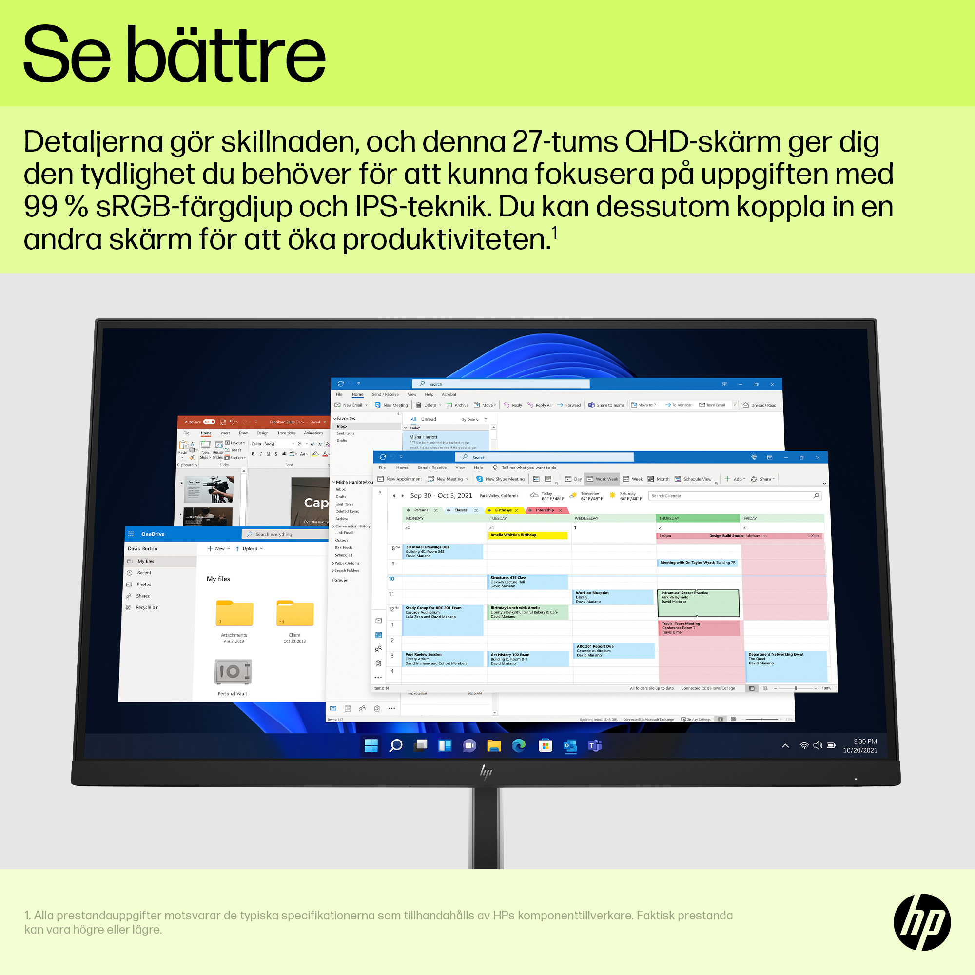 När skillnaden ligger i detaljerna levererar den här 27-tums (68,6 cm) QHD-skärmen alla klarhet som behövs för att behålla fokus på dagens uppgifter. Med ett fylligt 99 % sRGB-färgdjup och IPS-teknik[1] är det möjligt att uppleva livslika färger över breda betraktningsvinklar[2]. För ännu högre produktivitet kan vyerna expanderas genom att seriekoppla en andra skärm.