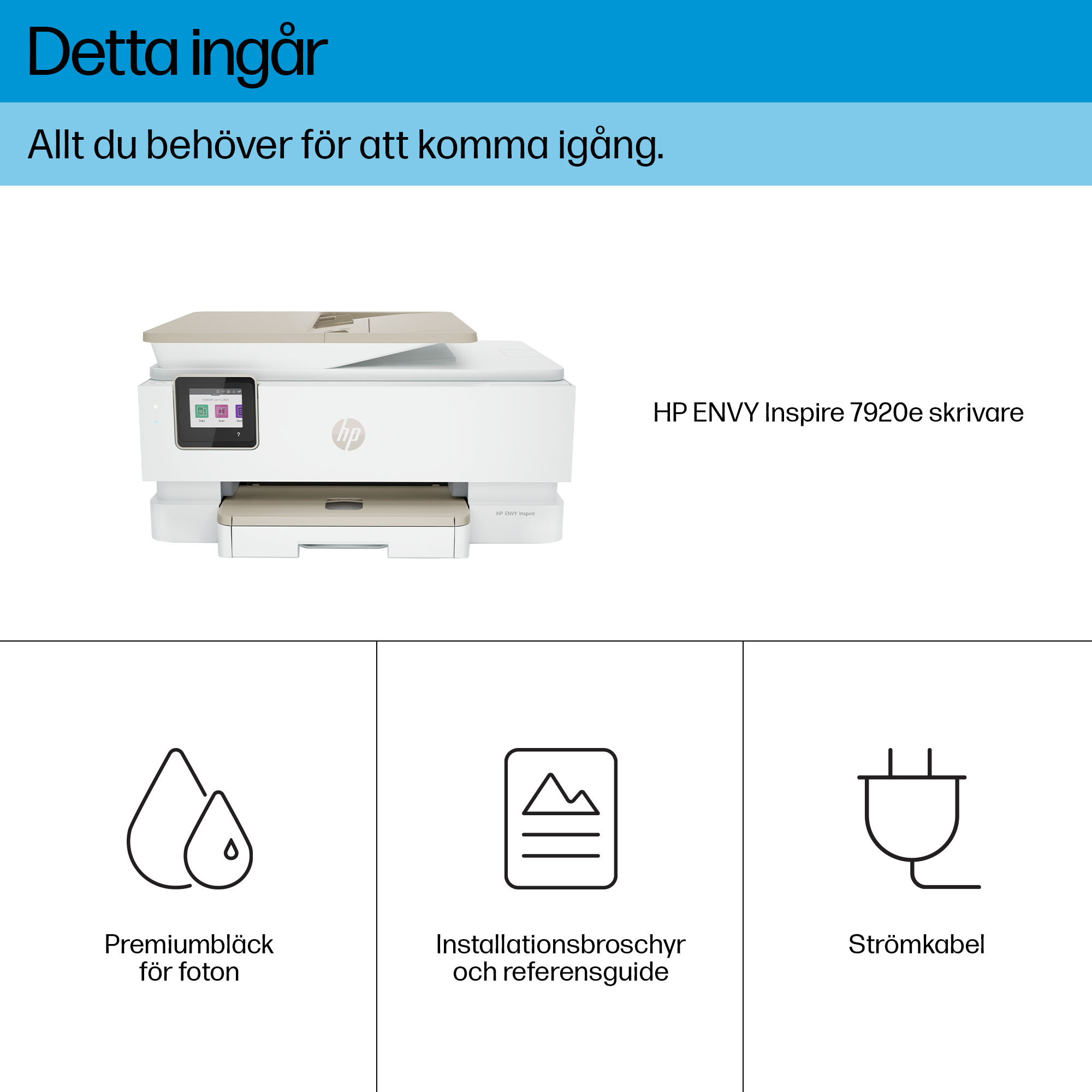 | Innehåll i lådan | HP ENVY Inspire 7920e Allt-i-ett-skrivare; HP 303 start svart Instant Ink Ready-patron; HP 303 start trefärgs Instant Ink Ready-patron; Broschyr med bläckvarning; Broschyr med föreskrifter; Installationshandbok; Referenshandbok; HP Advanced Photo-papper, glättat och matt, pappersprover medföljer; Strömkabel [mer information om bläck och sidkapacitet finns på http://hp.com/go/learnaboutsupplies] |