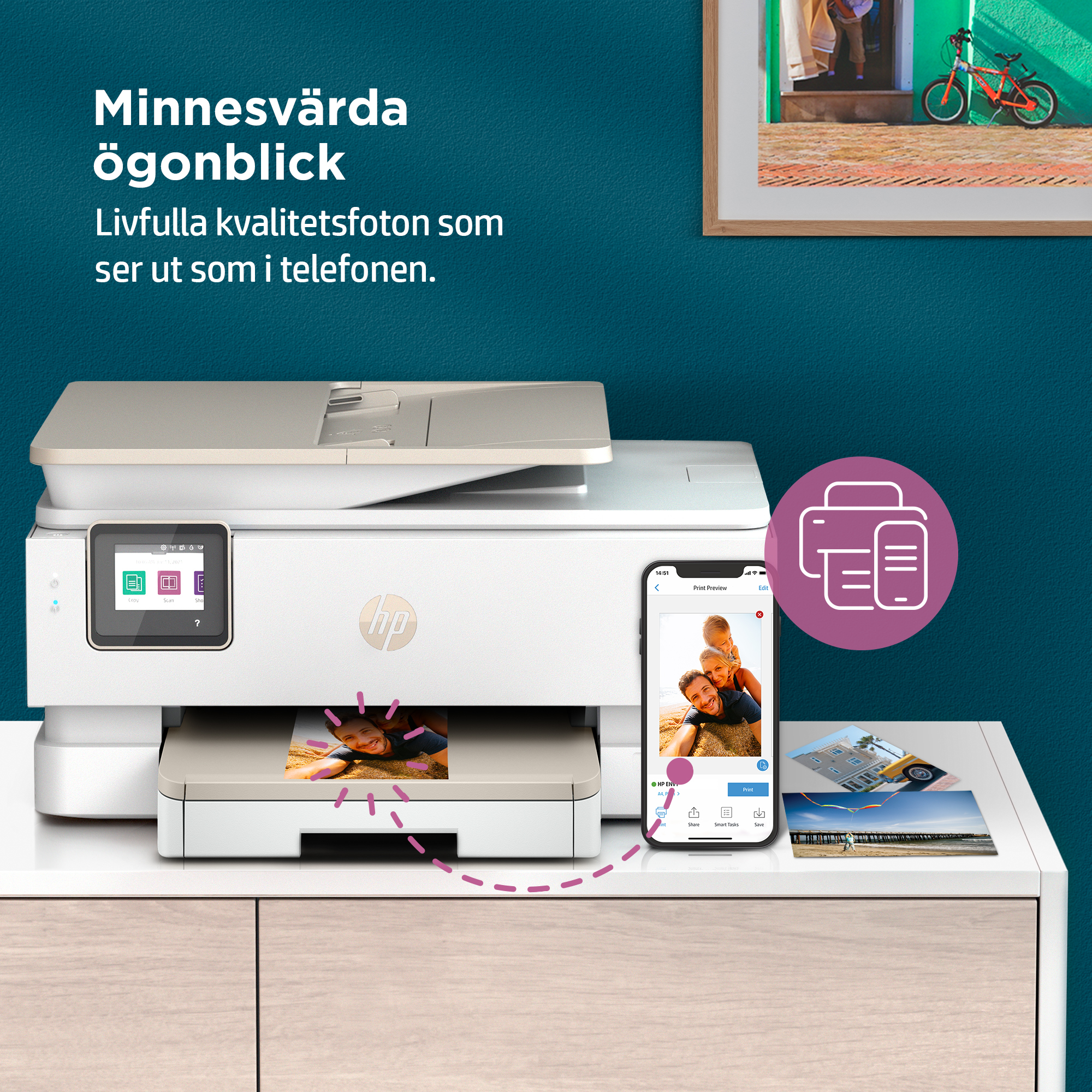 Sömlös foto- och dokumentutskrift av hög kvalitet med inbyggt fotofack och automatisk dokumentmatare.