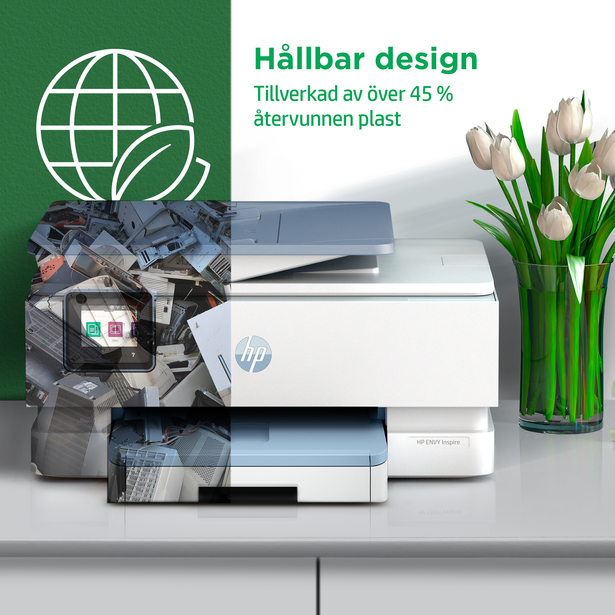 Hållbara tekniker och material | 45 % återvunnen plast från förbrukade konsumentprodukter; Återvinningsbart via HP Planet Partners; Utskrift med noll nettoavskogning med HP+ |