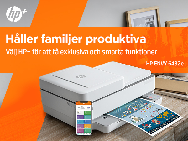 | Innehåll i lådan | HP ENVY 6432e Allt-i-ett-skrivare; HP 305 svart startpatron; HP 305 trefärgs startpatron; Broschyr med föreskrifter; Installationshandbok; Referenshandbok; Strömkabel; Mer information om bläckvolym och sidkapacitet finns på http://www.hp.com/go/learnaboutsupplies |