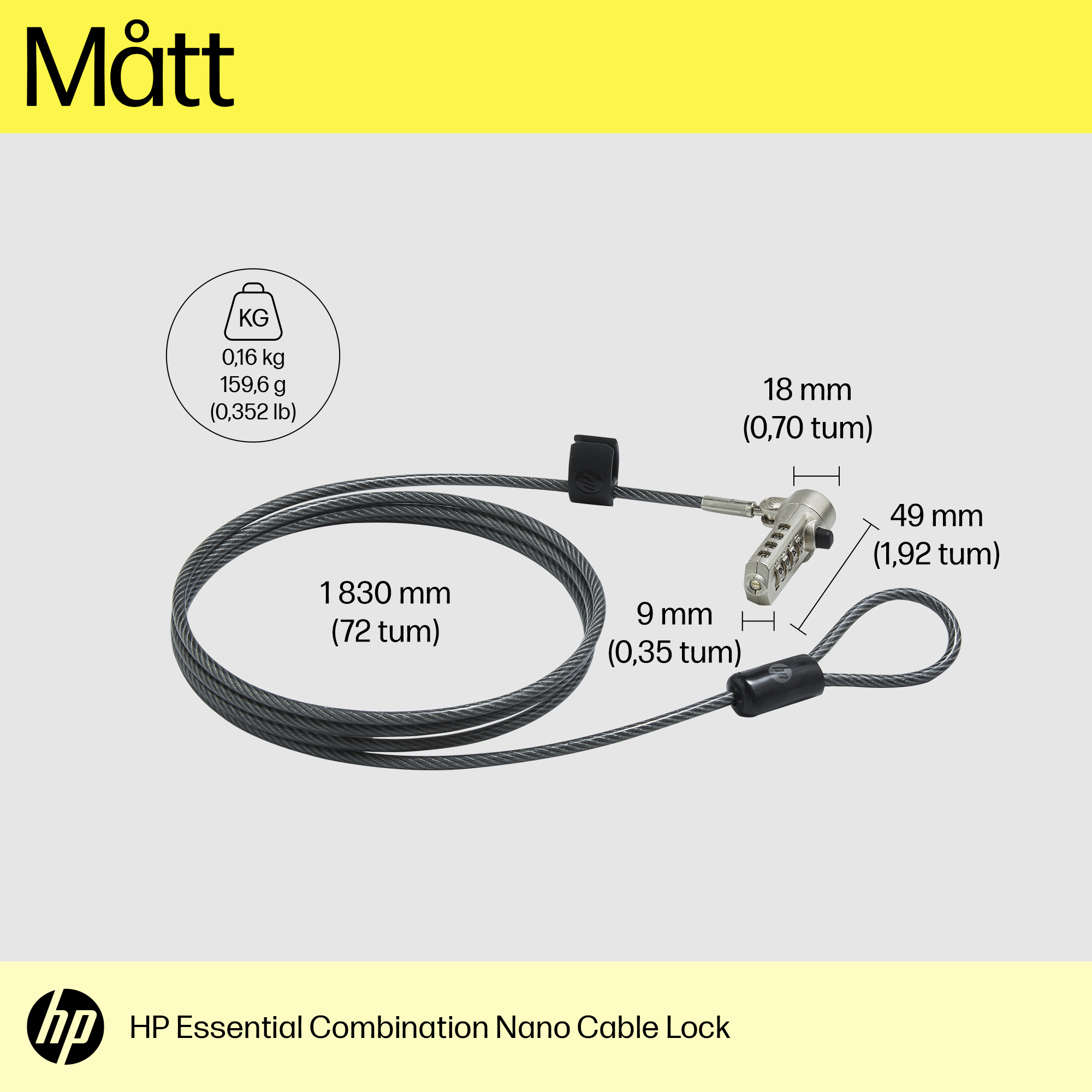 Håll er bärbar dator låst och säker med HP Essential Combination Nano Cable Lock, designad för alla HPs bärbara datorer med nanolåsplats[1]. Välj en kod som bara ni kommer ihåg och koppla ihop och lås kabellåset för problemfri säkerhet utan tangenter i stort sett överallt.