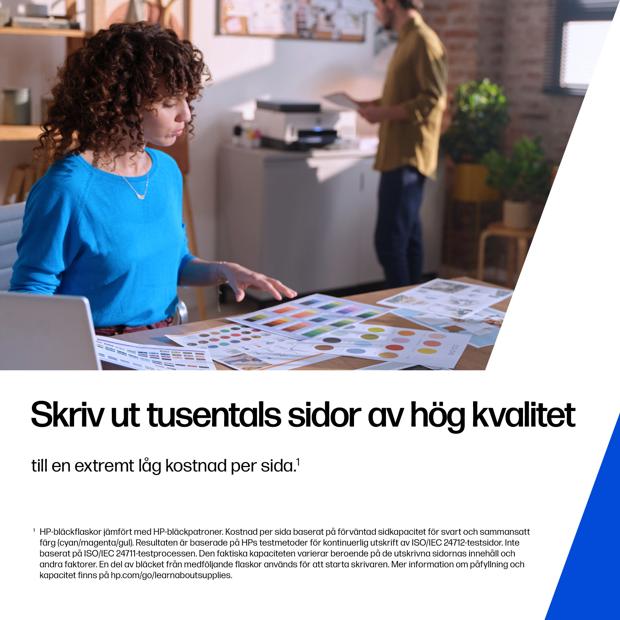 Skriv ut tusentals sidor med ett enda köp av en uppsättning HP-originalbläckflaskor med hög kapacitet – till en oerhört låg kostnad per sida.[1] Få utskrifter i stora volymer, ett enkelt sätt att fylla på med bläck och hög utskriftskvalitet och tillförlitlighet från HP.