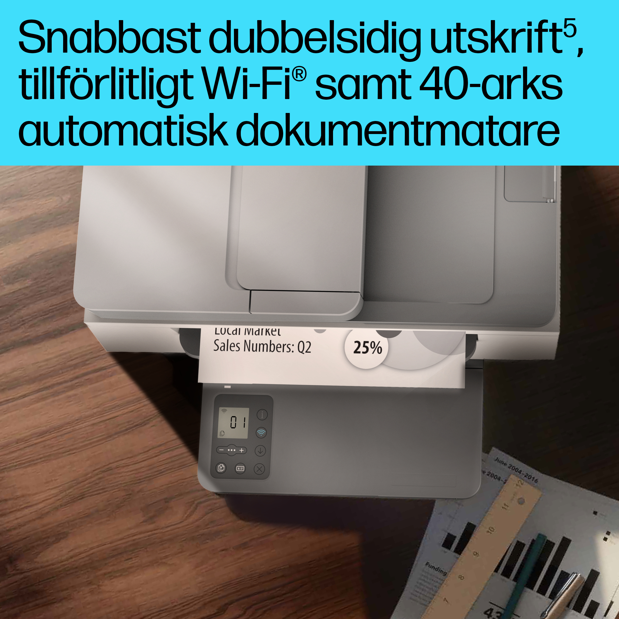 Skriv ut flersidiga dokument med klassens högsta hastighet för dubbelsidiga utskrifter.<sup>[2]</sup><sup>[2]</sup>