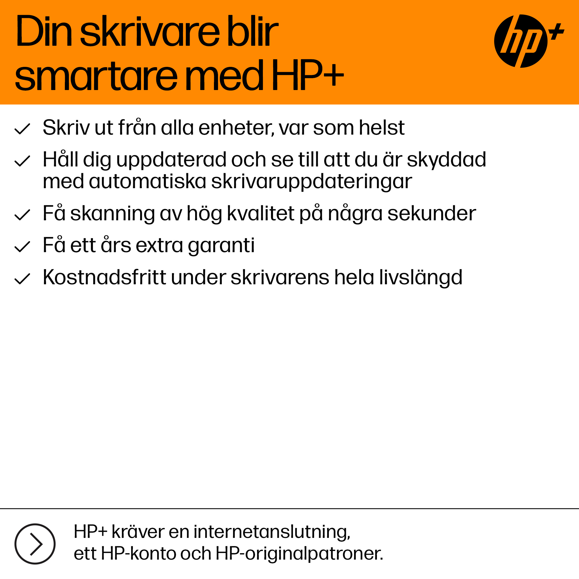 Den här skrivaren är kompatibel med HP+. Välj HP+ under produktinstallationen för att ta del av fördelarna. För att HP+ ska fungera under skrivarens hela livstid krävs ett HP-konto, kontinuerlig anslutning till internet och att du bara använder HP-originalbläckpatroner. Mer information på: http://www.hp.com/plus