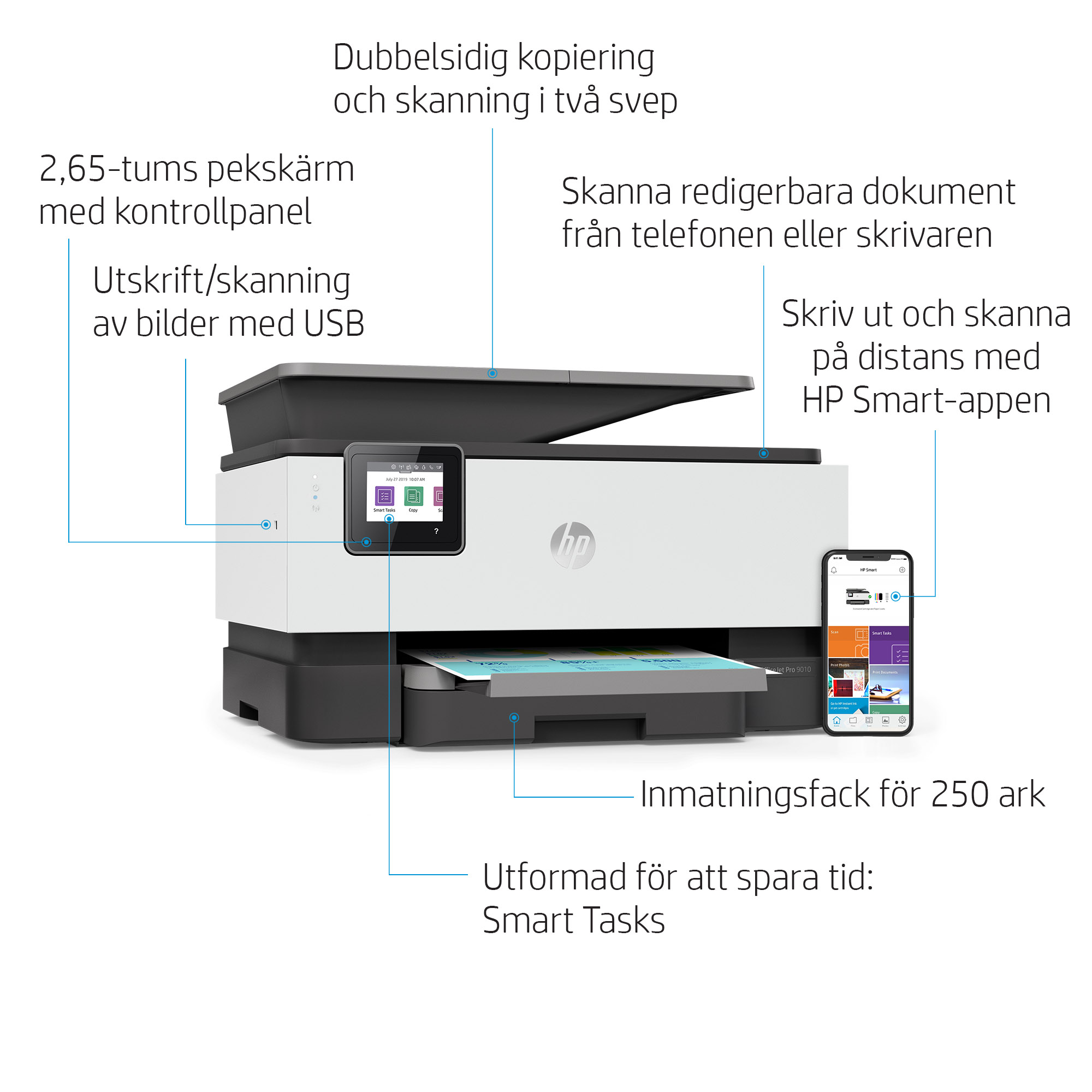 Utför repetitiva uppgifter snabbare med Smart Tasks.[1] Skanna till molnet, e-post med mera – med bara ett knapptryck.[1]