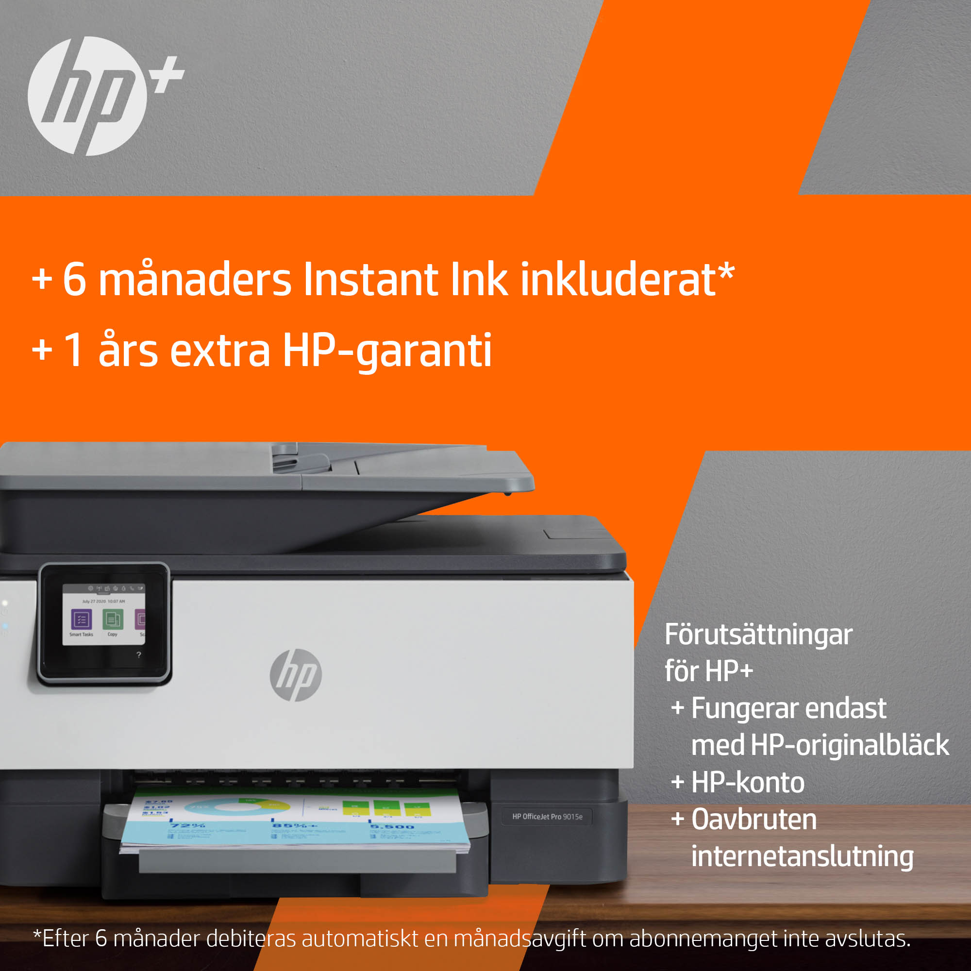 Den här skrivaren är kompatibel med HP+. Välj HP+ under produktinstallationen för att ta del av fördelarna. För att HP+ ska fungera under skrivarens hela livstid krävs ett HP-konto, kontinuerlig anslutning till internet och att du bara använder HP-originalbläckpatroner. Mer information på: http://www.hp.com/plus-faq