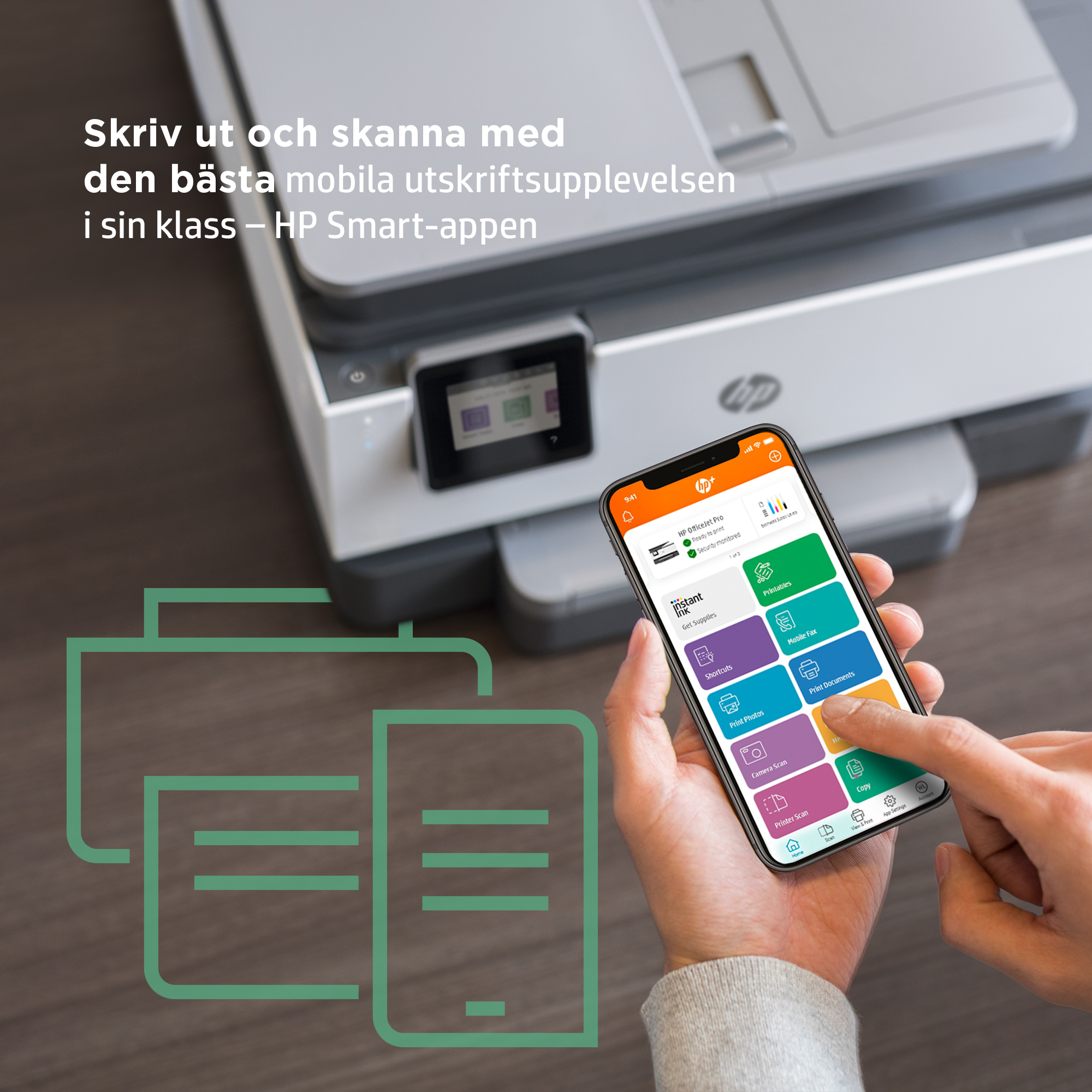 Skriv ut och skanna direkt från handen. Ta del av avancerade produktivitetsfunktioner i 2 år med HP+.[5]