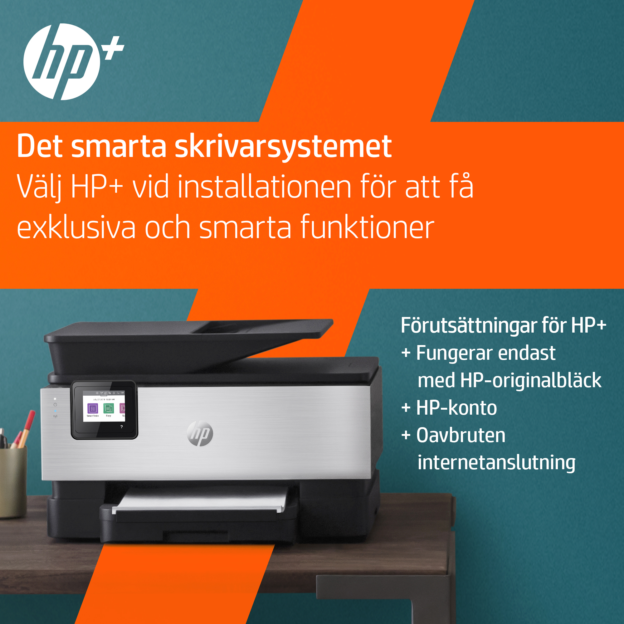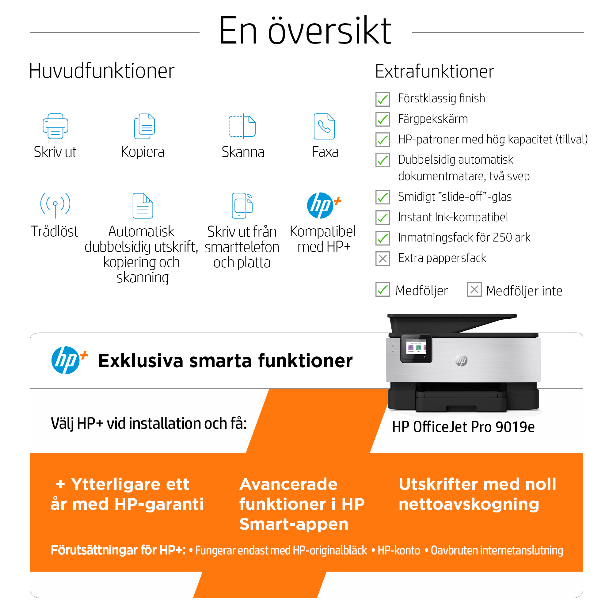 Den här skrivaren är kompatibel med HP+. Välj HP+ under produktinstallationen för att ta del av fördelarna. För att HP+ ska fungera under skrivarens hela livstid krävs ett HP-konto, kontinuerlig anslutning till internet och att du bara använder HP-originalbläckpatroner. Mer information på: http://www.hp.com/plus-faq