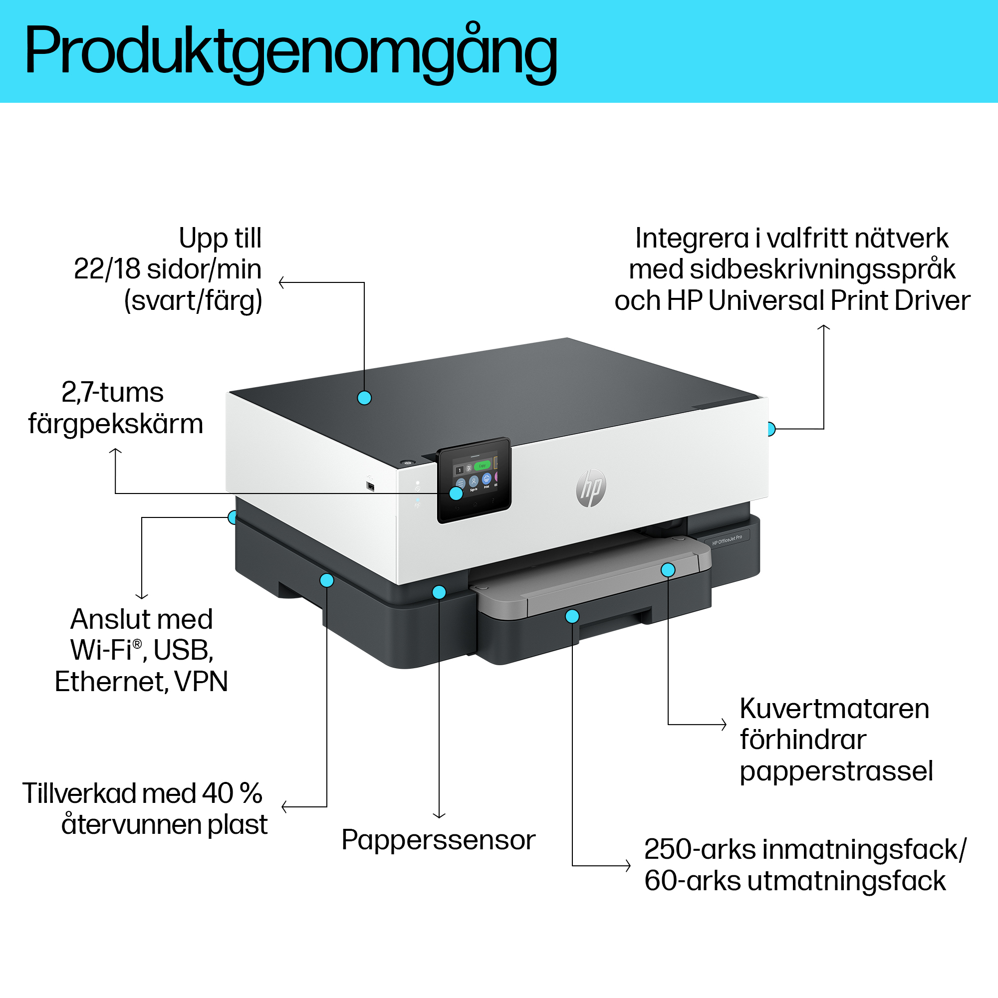| Innehåll i lådan | HP OfficeJet Pro 9110b-skrivare; HP 937 svart startbläckpatron (cirka 800 sidor); HP 937 cyan startbläckpatron (cirka 420 sidor); HP 937 magenta startbläckpatron (cirka 420 sidor); HP 937 gul startbläckpatron (cirka 420 sidor). Broschyr med föreskrifter; Broschyr med bläckvarning; Strömkabel; Installationsanvisningar; Referenshandbok. [Den faktiska kapaciteten varierar betydligt beroende på de utskrivna sidornas innehåll och andra faktorer. Se https://www.hp.com/go/learnaboutsupplies för mer information] |