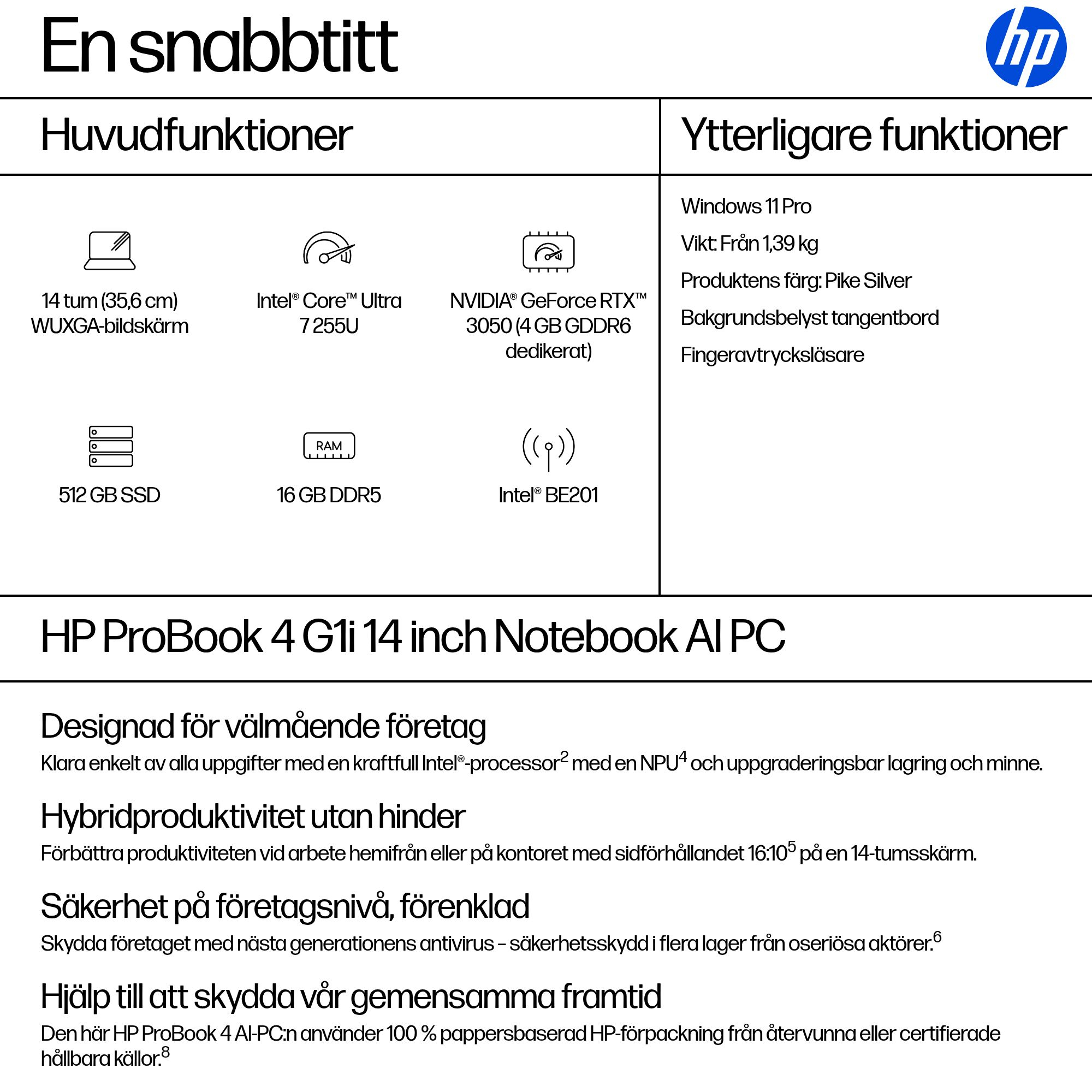HP ProBook 4 P4G1i14 U7 255U 14 16GB/512 PC NX Intel Core Ultra 7 Bärbar dator 35,6 cm (14") WUXGA DDR5-SDRAM 512 GB SSD Wi-Fi 7 (802.11be) Windows 11 Pro AI PC Silver