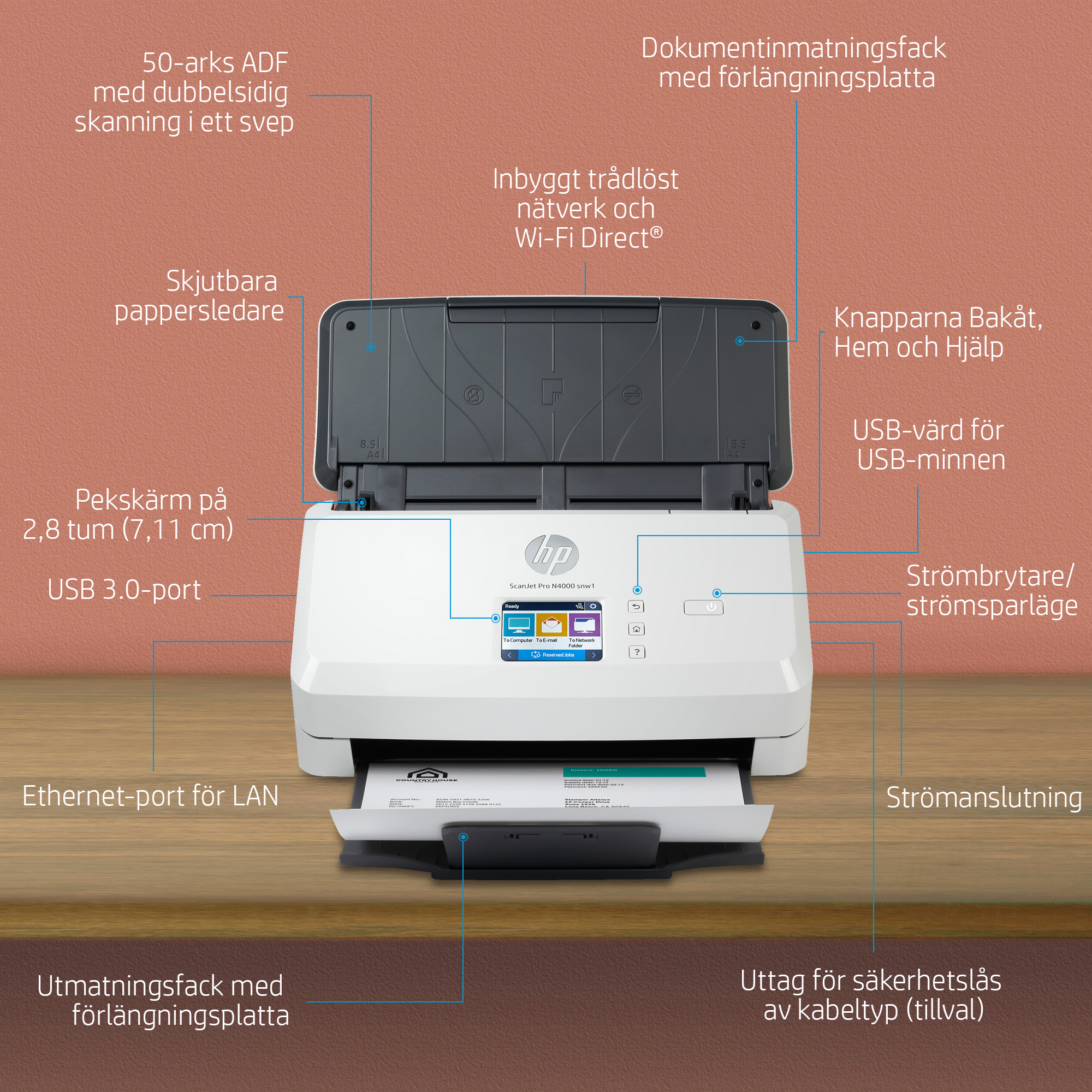 Innehåll i lådan | HP ScanJet Pro N4000 snw1 Sheet-feed Scanner; Power cord; Power adapter; USB cable; Scanner engine; Flyers; Install guide |