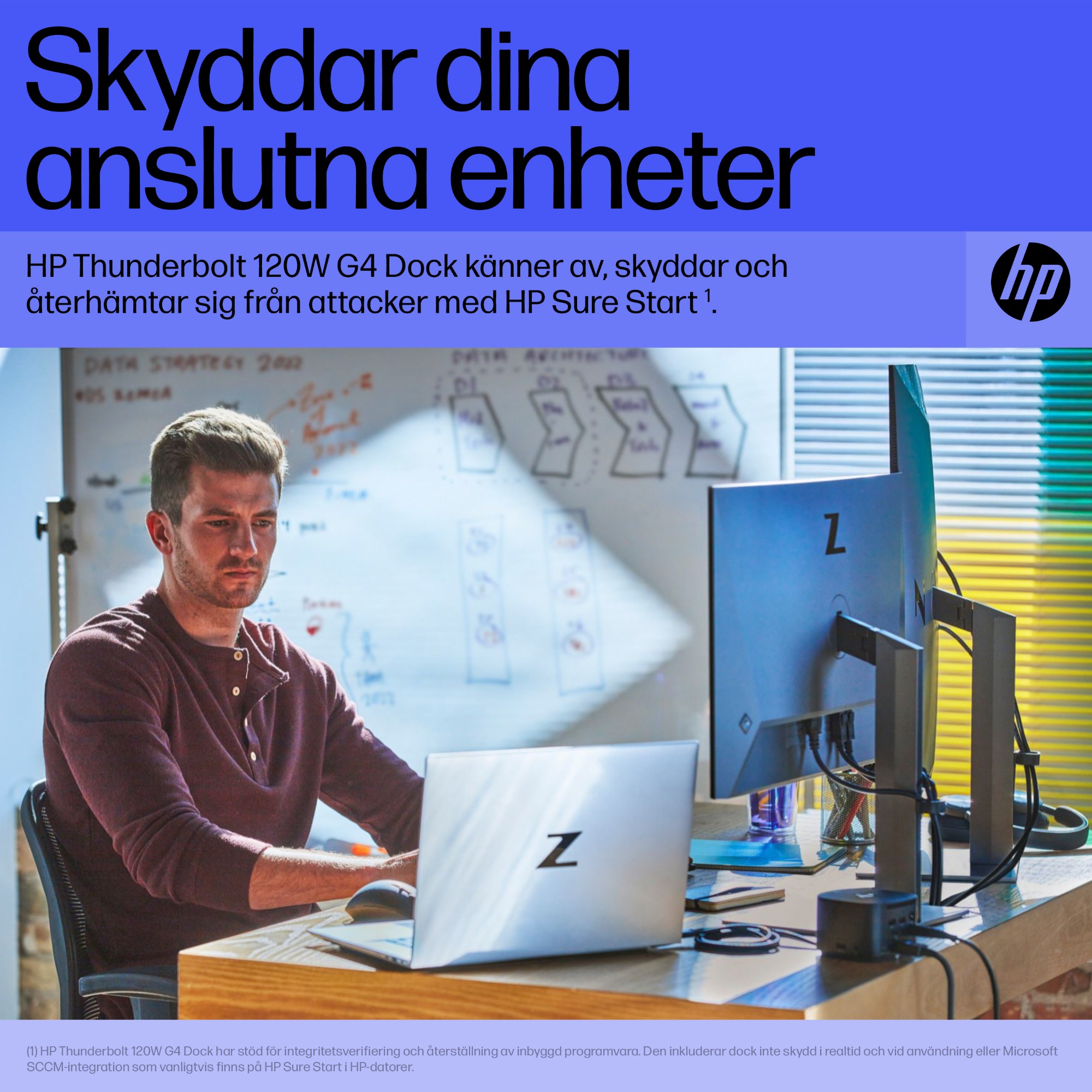 Känn dig trygg och säker från det ögonblick du loggar in. HP Thunderbolt-dockan G4 med HP Sure Start[3] förhindrar hackare från att använda dockan för att attackera nätverket och den anslutna bärbara datorn. Allt som är anslutet till denna docka är skyddat och uppfyller alla NIST 800-193-krav.