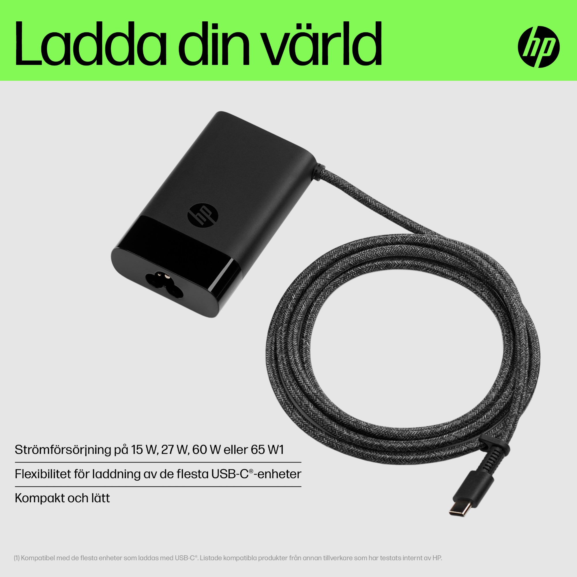 Ladda de flesta USB-C-enheter med endast en kompakt laddare. HP 65 W USB-C bärbar laddare levererar upp till 65 W ström som är tillräckligt för nästan alla USB-C-enheter.