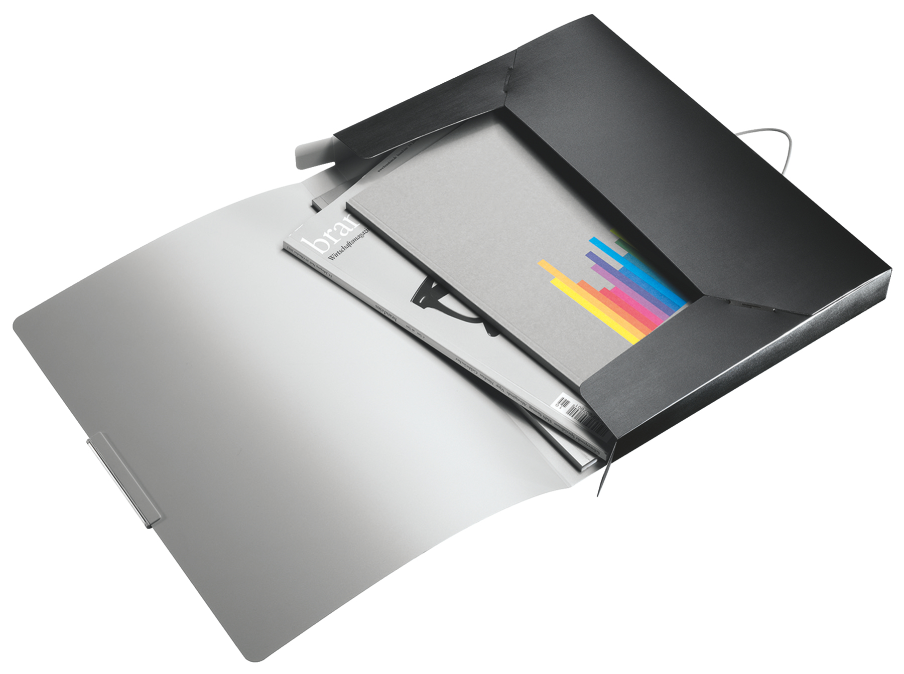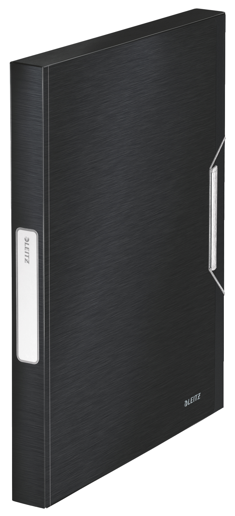 Distinkt boxmapp i PP med en mjuk borstad yta och i ett sofistikerat utbud av färger: polarvit, granatröd, celadongrön, titanblå och sidensvart. Idealisk för transport och lagring av stora dokument, mappar eller andra Style produkter.