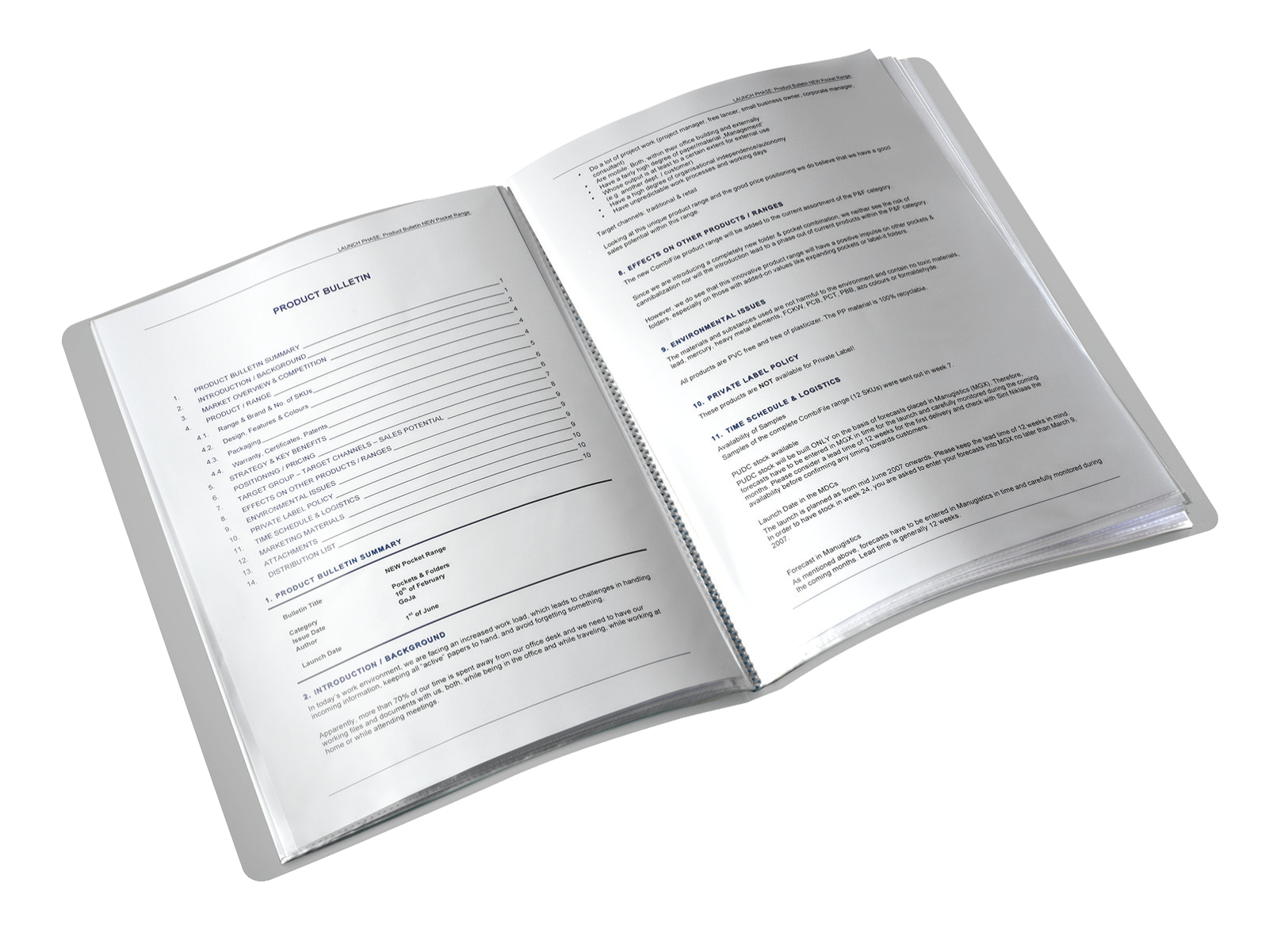 Distinkt, högkvalitativ demopärm i PP med en mjuk borstad yta och i en sofistikerad färgskala: polarvit, granatröd, celadongrön, titanblå och sidensvart. Perfekt för presentationer eller organisering av dokument.
