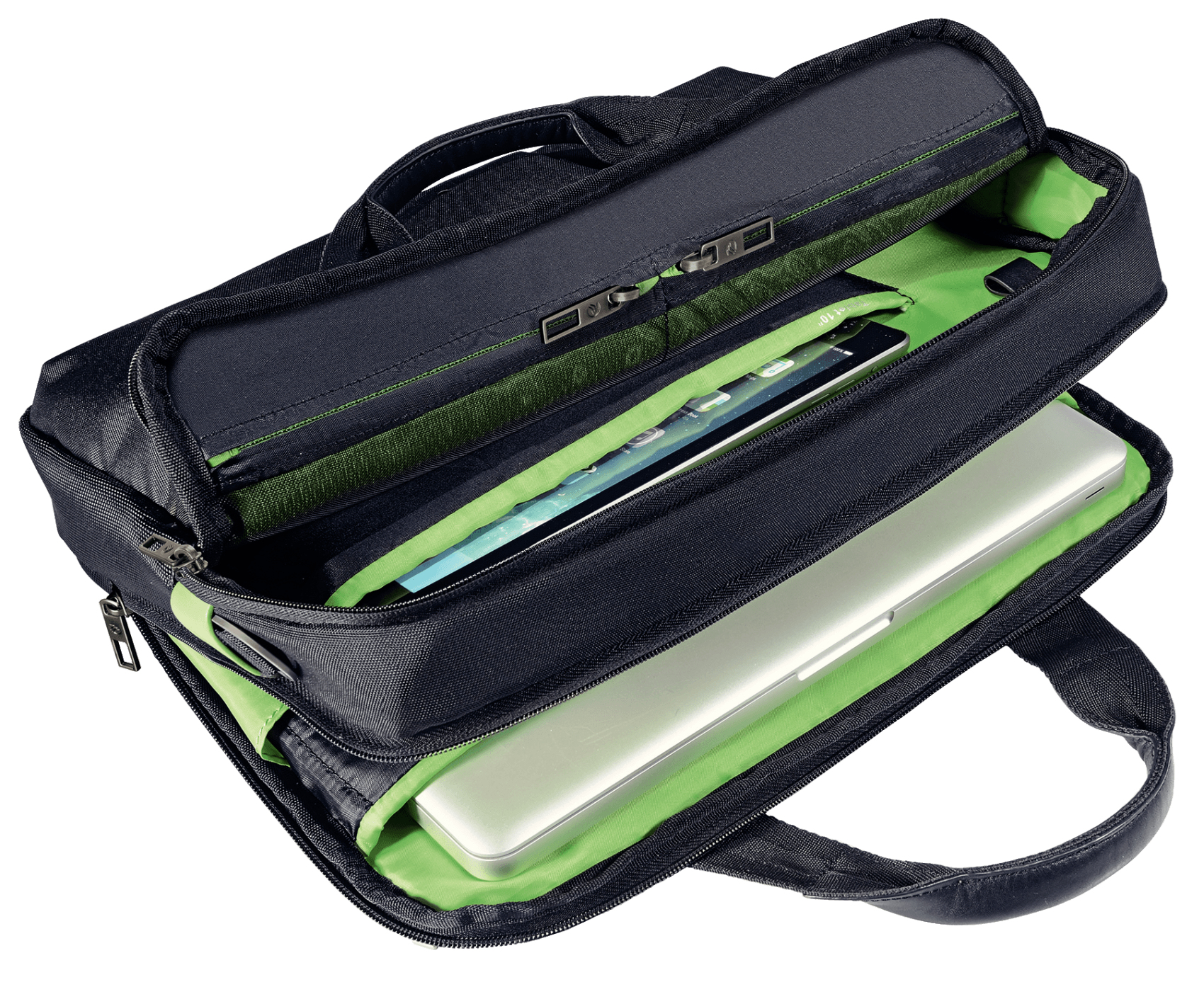 Lätt affärsportfölj med ett huvudfack och ett mindre fack på utsidan. Distinkt och elegant design med smarta blixtlås och eleganta spännen. Bär den med det äkta lädervadderade handtaget, den justerbara axelremmen eller fäst den på din bagagevagn.