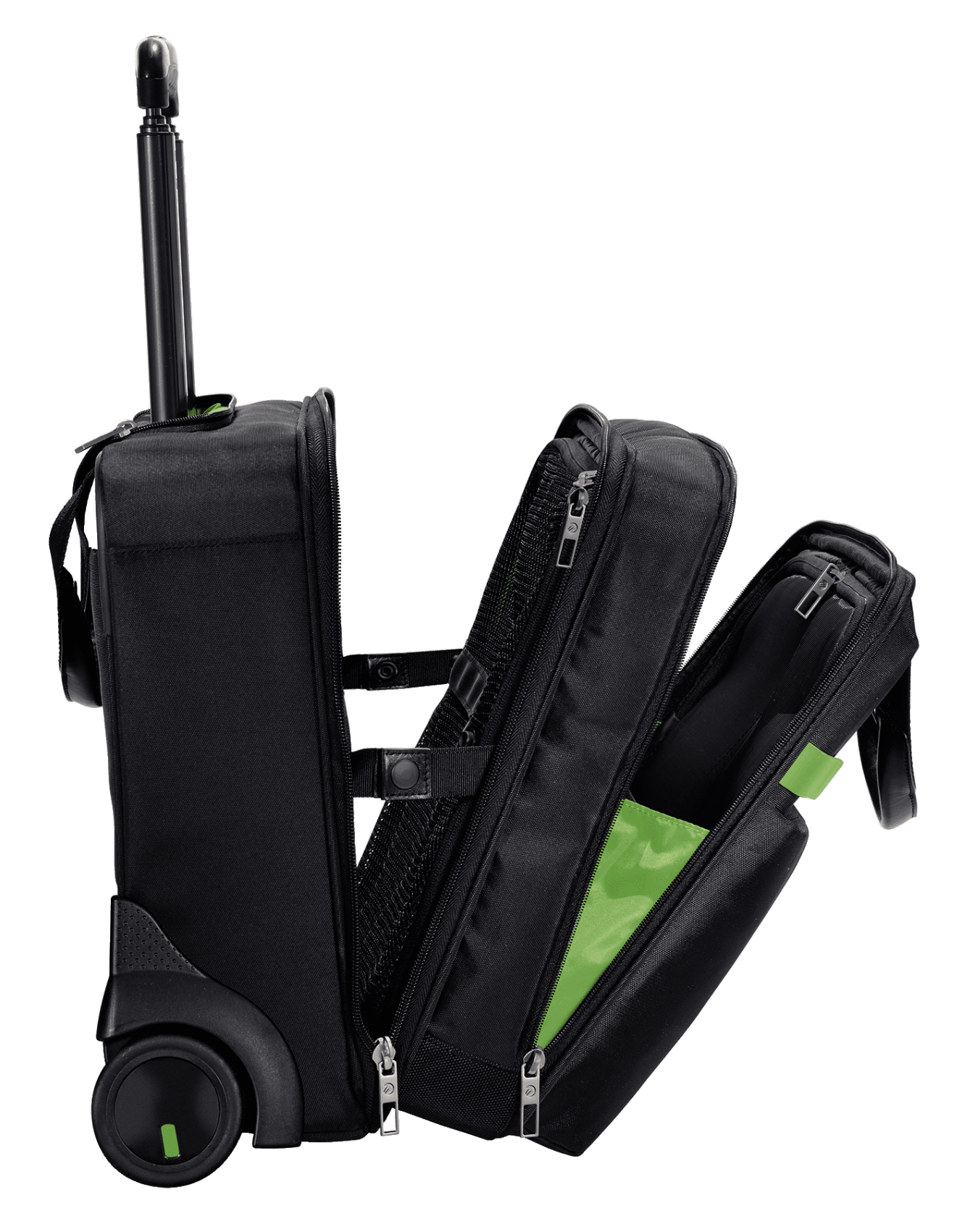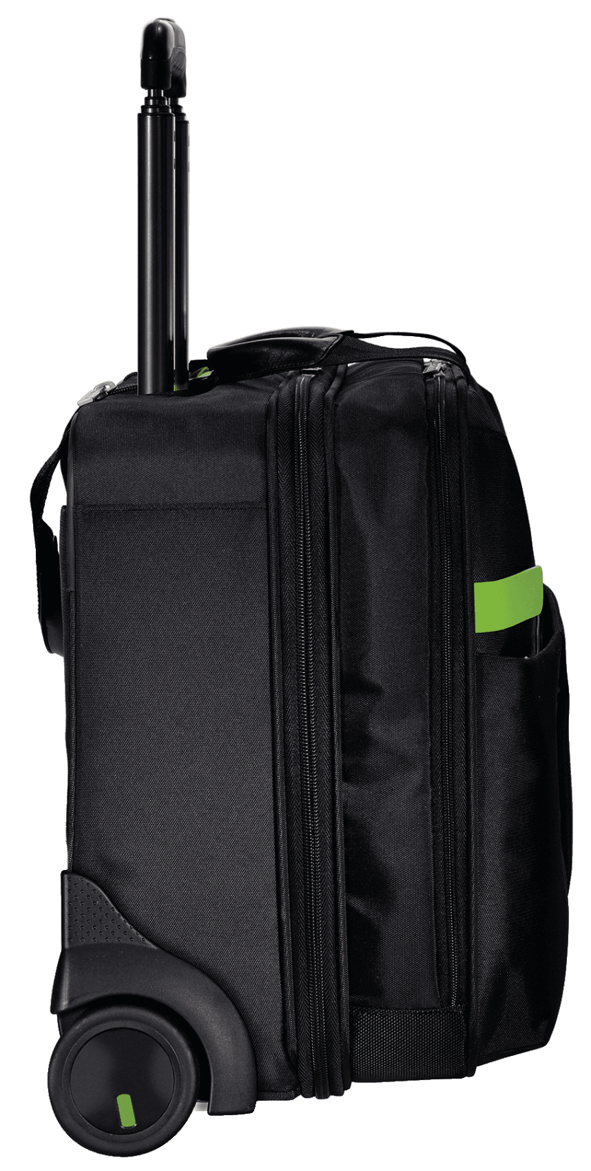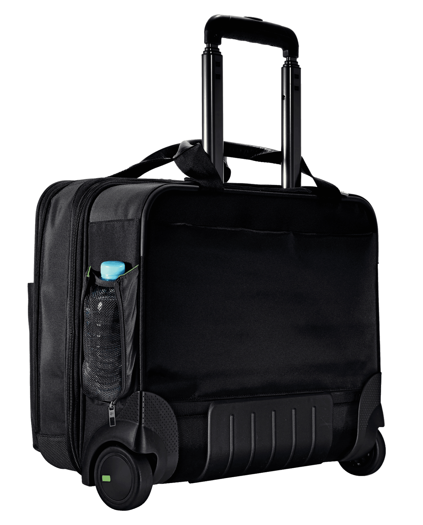 Lätt trolleyväska med två rymliga huvudfack och ett mindre fack på utsidan. Tillåter tydlig åtskillnad mellan arbetsutrustning och privata kläder. Bekväm resa med det lättrullande 2-hjulsystemet (ABEC3) och utdragbart handtag med dubbla rör eller bär den med de äkta lädervadderade handtagen. Du kan även fästa den på en bagagevagn. Kan kombineras med alla övriga väskor i Leitz Complete serien.