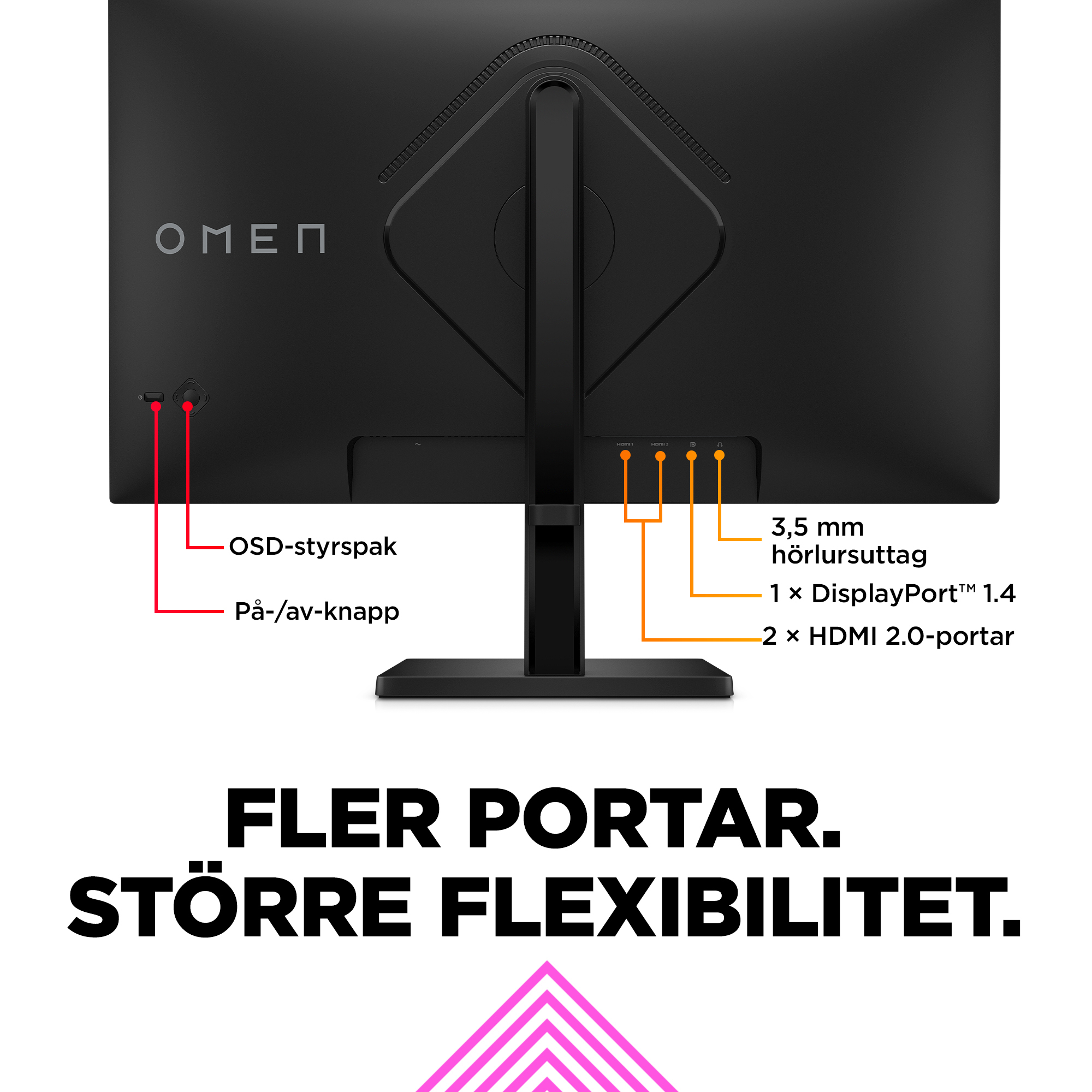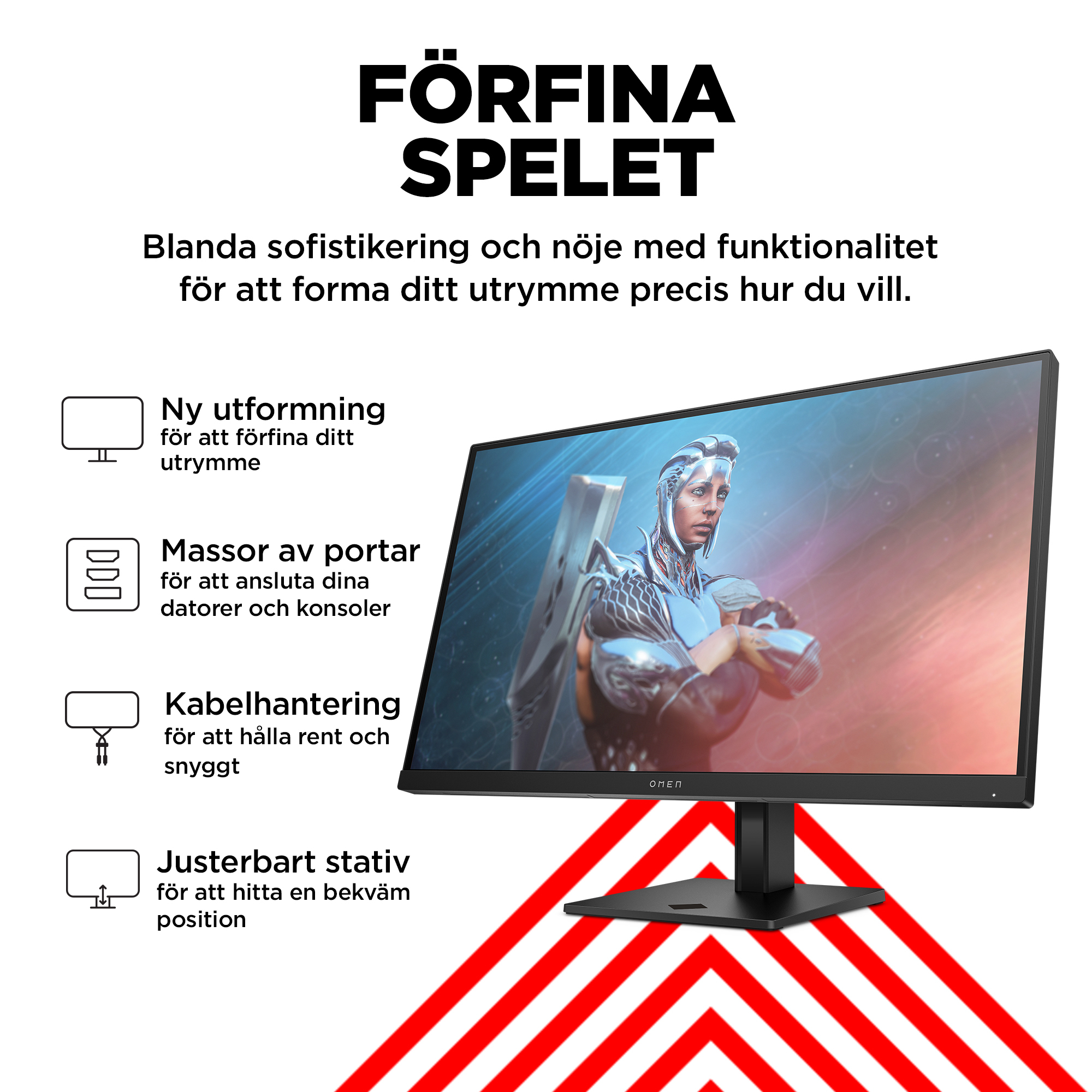 Den nya OMEN-stilen imponerar både vid spelande och på skrivbordet med en sofistikerad och rolig design som tar gaming-system till nästa nivå. Den levereras med portar för speldatorn, spelkonsolen och till och med arbetsdatorn. Tack vare enkel kabelhantering och ett helt justerbart stativ går det att organisera skrivbordet precis som det ska vara.