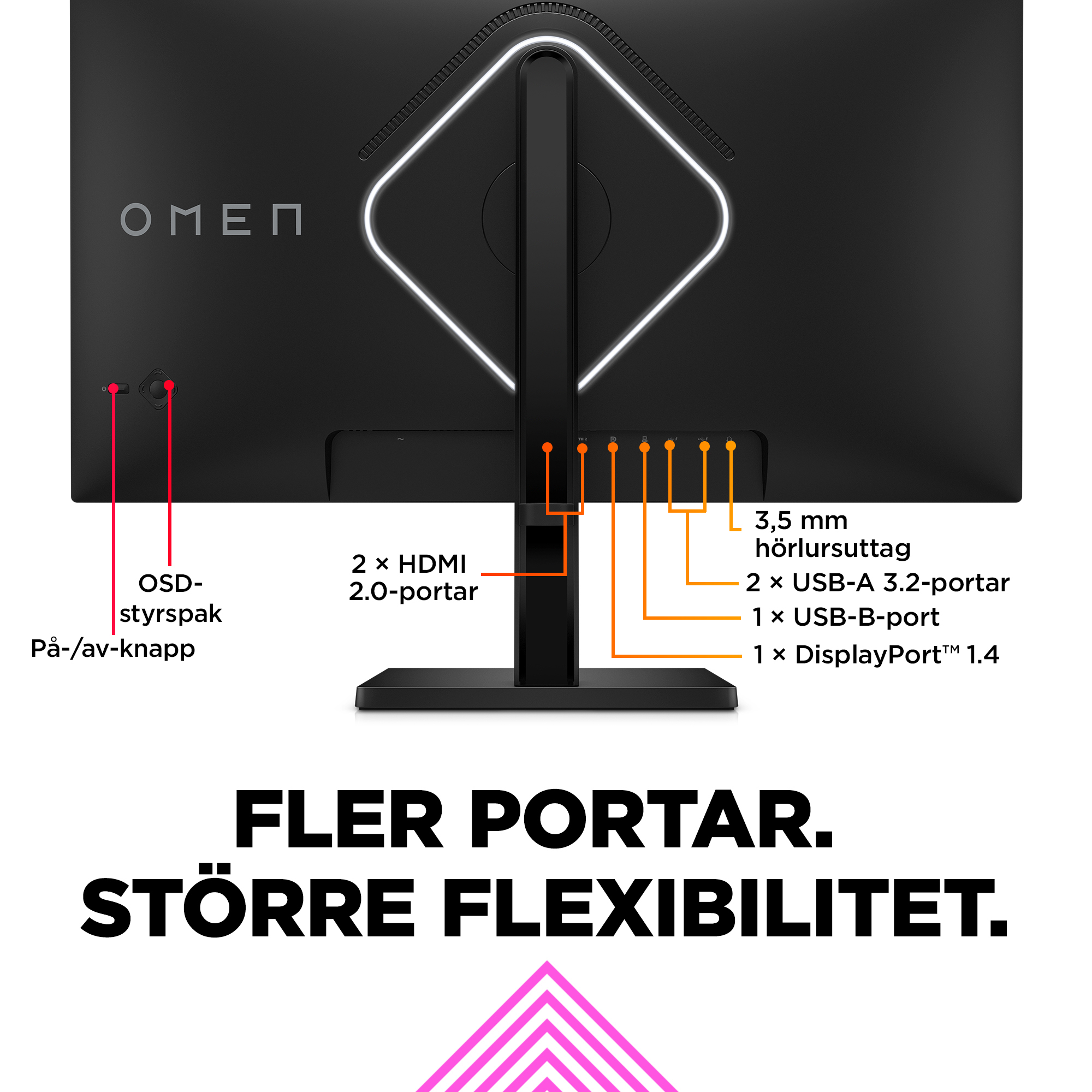 Nå nya konkurrenskraftiga höjder med HP OMEN 27 tum QHD 240 Hz Gaming-skärm. Den här skärmen är kompatibel med NVIDIA G-SYNC och ger ultrajämn grafik och enastående detaljer[1]. Hastighet kombinerad med en rolig men förstklassig och elegant design som imponerar både vid spelande och på skrivbordet.