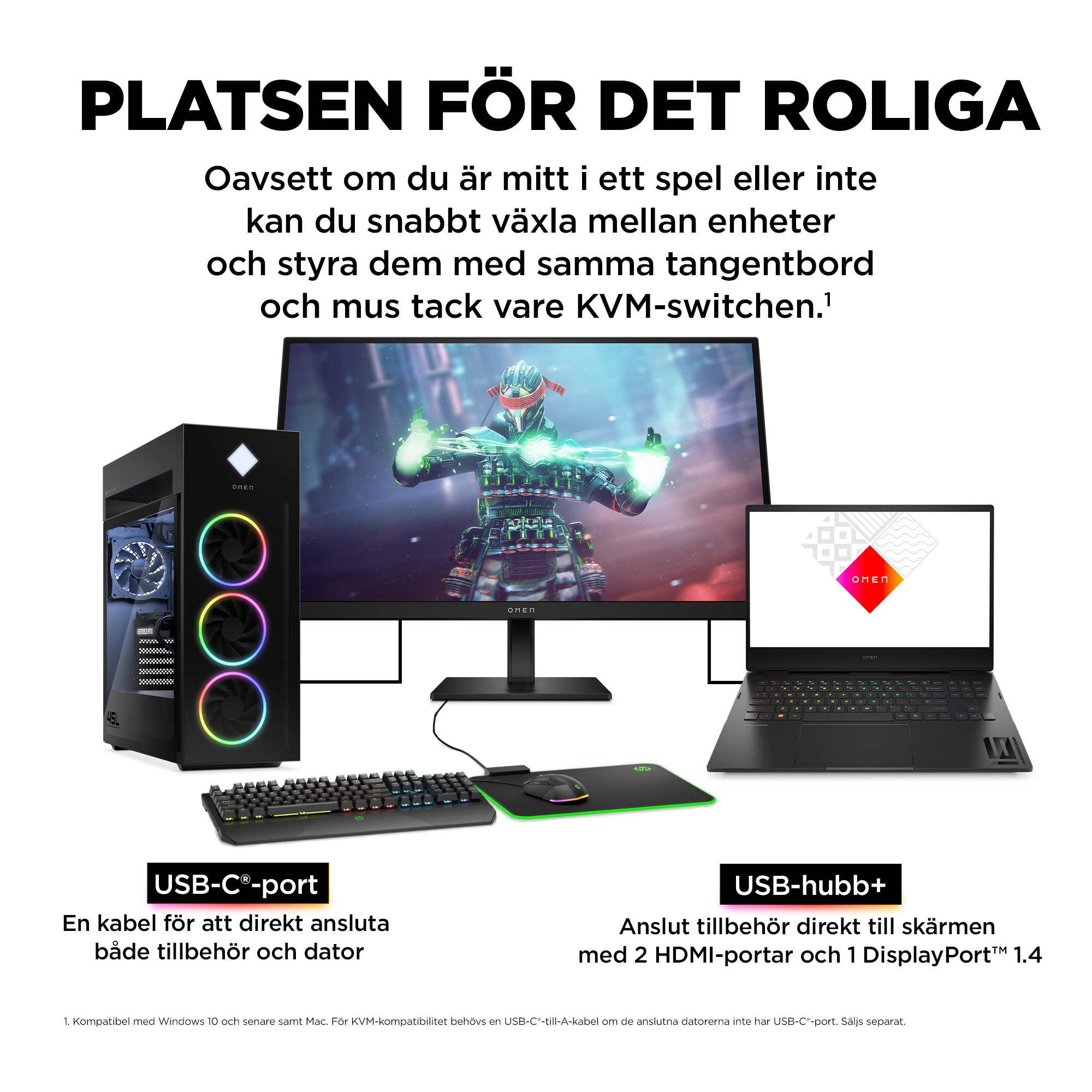Platsen för allt spelande. Växla snabbt mellan enheter och kontrollera dem med samma tangentbord och mus tack vare KVM-switchen<sup>[2]</sup> – både vid spelande och på skrivbordet. Och allt drivs av USB-hubben och en USB C®-anslutning med data och video.