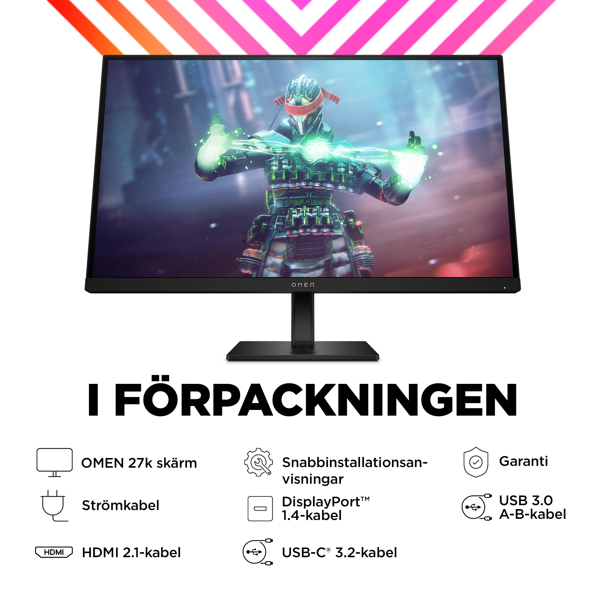 Spela, skapa och upplev allt möjligt på platsen för allt roligt – i 4K[1]. Växla blixtsnabbt mellan två enheter och kontrollera båda två med samma tangentbord och mus – allt tack vare den inbyggda KVM-switchen[2]. Få enastående 4K-grafik[1] på datorer, spelkonsoler och mer med HP OMEN 27 tum UHD 144 Hz Gaming-skärmen.